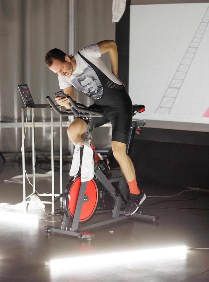 NoPares(sigue,sigue), de Sergi Casero Nieto, es una performance participativa que explora las violencias que se esconden tras las fuerzas productivas del deseo neoliberal; señalando las internalizadas lógicas neoliberales de productividad, eficiencia y rendimiento en la búsqueda constante de una supuesta autorrealización, de la inalcanzable “mejor versión” de nosotros mismos. El proyecto desenmascara las formas de violencia y dominación que se esconden tras la euforia y el optimismo de los mantras tecnocapitalistas, mostrando la culpa, el autocastigo y la insatisfacción que la siguen. Como un Sísifo contemporáneo atrapado en el engranaje incesante del capital ––que nunca puede ser satisfecho y del que no se puede dejar de pedalear––, la performance, a medio camino entre una clase de spinning y una conferencia dramatizada, se presenta como un esbozo que aún está por terminar, una obra que intenta superarse a sí misma en bucle