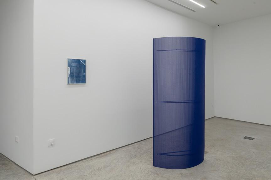 Durante su beca en Matadero Madrid, Florencia Rojas desarrolló una parte del proyecto escultórico titulado Como una casa, basado en dos relatos anónimos de personas migrantes en el Estado español, ambos ubicados en Centros de Internamiento de Extranjeros (CIE). Aunque sus experiencias varían, comparten el encierro forzado en un CIE y el posterior silenciamiento que enfrentaron, o con el que se vieron obligados a convivir debido a su vulnerabilidad legal y a la violación de sus derechos bajo la ley de extranjería. Ainara (nombre ficticio) estuvo detenida en el CIE de Aluche (Madrid). Su testimonio sobre la vida en el centro sirvió de base para replicar una de las mamparas azules que cubrían las ventanas de su celda; este gesto simboliza el régimen de opacidad que caracteriza a todo