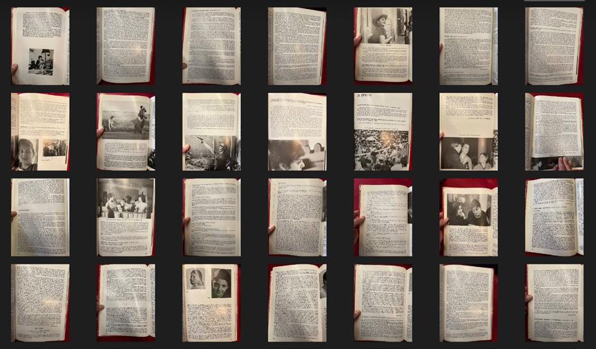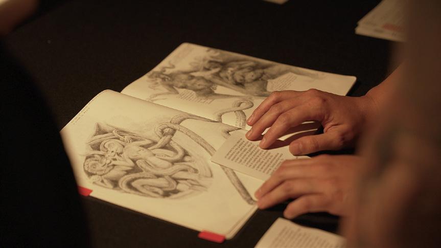 de sus fondos, abriendo correspondencias entre ficción y realidad. Los textos sobre la Querella de las mujeres y las visiones monstruosas y demoníacas del cuerpo femenino durante el Medievo, recogidos en la Biblioteca de Mujeres, emergían entre las transcripciones de las entrevistas sobre Biblioletras, que daban cuenta de las tensiones entre autogestión e institución, la difícil negociación hacia el común y la progresiva privatización y desahucio del espacio público madrileño. Este archivo fue presentado al público en Matadero Madrid en una lectura performativa a dúo entre Sara Santana López y Laura Bartolomé. Una cámara cenital mostraba a la audiencia los documentos que iban manejando y leyendo en voz alta, entre los cuales se encontraban dibujos, fotografías, relatos medievales de la leyenda áurea, artículos de periódico o fragmentos de los testimonios de la investigación.