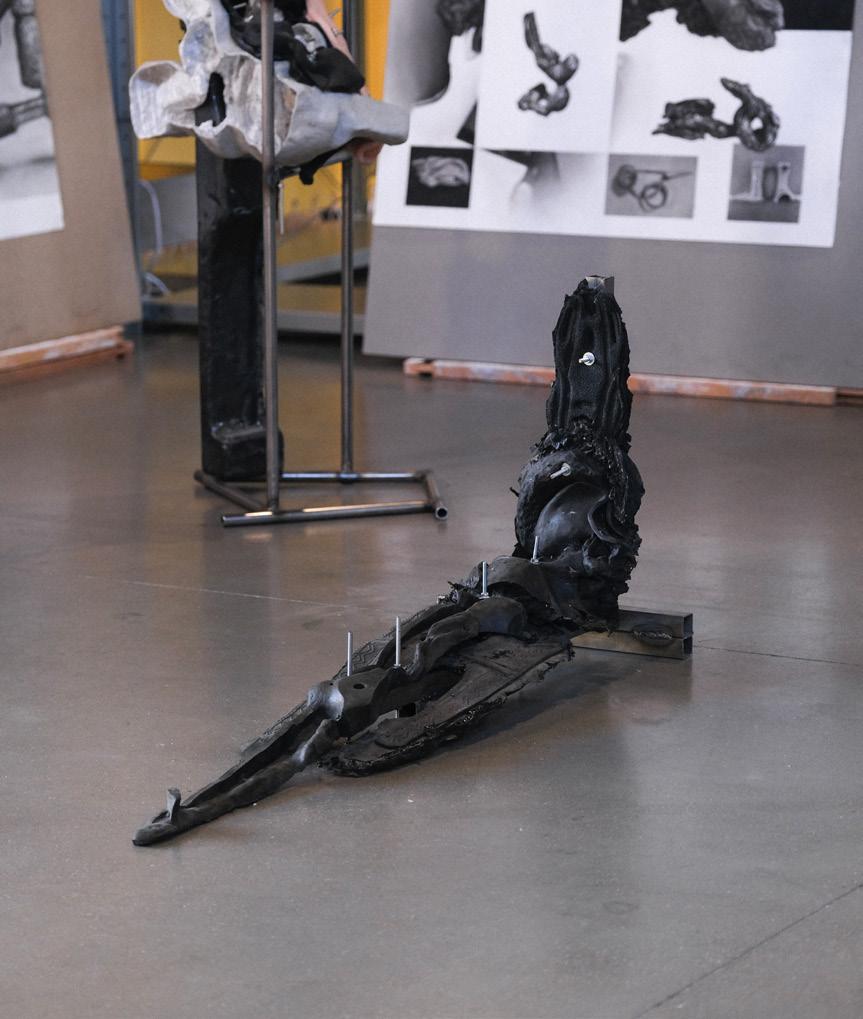 Una fíbula es un broche que permitía sujetar o unir los ropajes y que podía dar lugar a objetos preciosistas cuya opulencia denotaba la jerarquía del individuo. La enorme variedad de hibridaciones entre sus tipologías durante tantos siglos puede leerse tanto como una memoria violenta y colonial entre pueblos como una simbiosis cultural entre civilizaciones del pasado. Los procedimientos escultóricos a los que se somete producen una posibilidad que, estando connotada por esta dualidad, modula una corporalidad posthumana y una temporalidad especulativa entre un no-cuerpo futuro y una tecnología perdida. La misma estructura de las fíbulas sugiere una cualidad recursiva y autopoiética que vuelve sobre sí y se autosustenta.