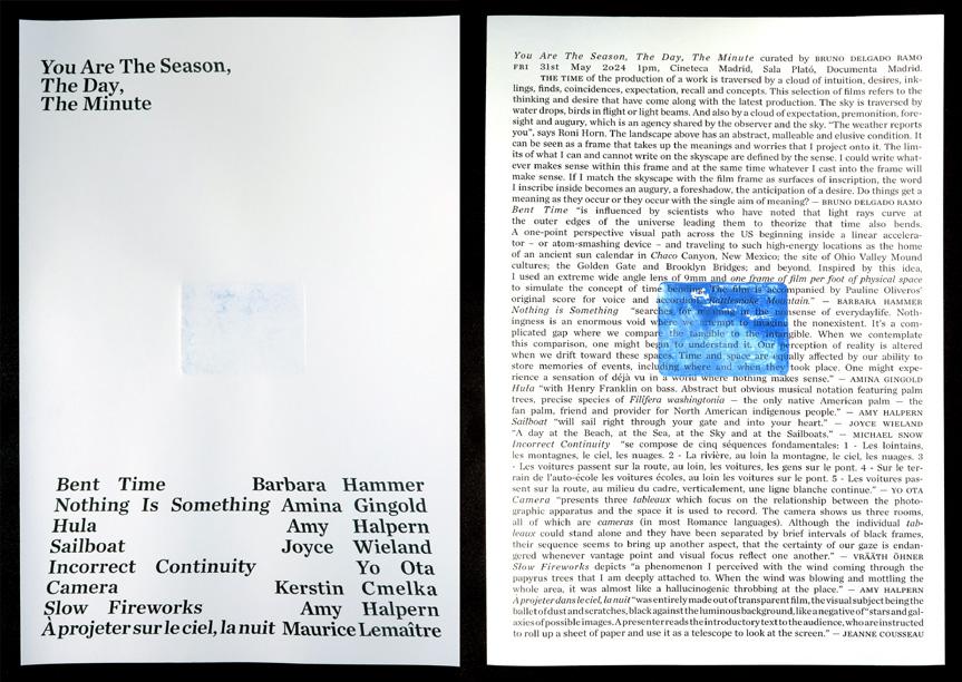 La dimensión sonora del proyecto ha involucrado la filmación con sonido sincrónico en soporte de película, e incorpora lecturas de fragmentos de textos con las voces de Anne-Sophie Girault, residente del programa Animario, Gio Soifer, residente del programa PEEPA o Carmen Ramo Herrero. Parte de este proyecto de residencia ha sido también el programa de películas You AreThe Season,The Day, The Minute presentado en el contexto de Documenta Madrid 2024. A través de películas de distintas autoras, la propuesta explora algunas de las intuiciones y los hallazgos del proceso de trabajo.