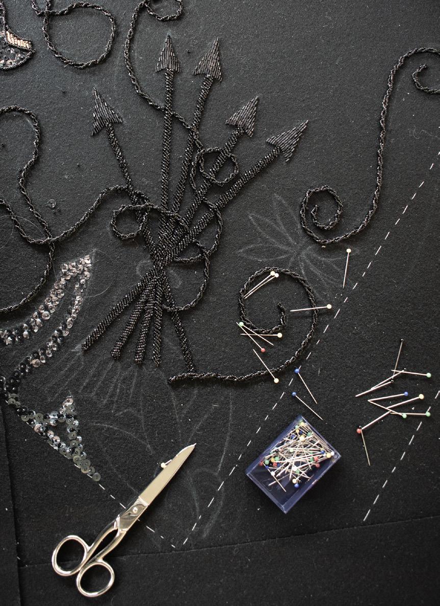 sin embargo, destacan en ella, según el creador: «los violentos tintes políticos que conforman el tejido de esta prenda». Cada cordonería, cuenca de vidrio, abalorio, lentejuela y bordado que ornamentan este mantelo dibujan, según el artista una estampa de simbología, monogramas y propaganda falangista; yugos, flechas e insignias de honor.