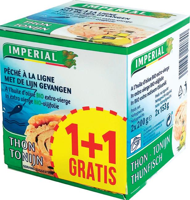 6 4 50 2 99 3 35 4 29 Mini MAGNUM Hetgamma La gamme Voorbeeld / Exemple : Classic 2 x (6 x 55 ml) 5.08 €/L Normaleprijs / Prix normal 2 x (6 x 55 ml) : 6.70 € Lijngevangentonijn Thon pêché à la ligne IMPERIAL Inbioolijfolie A l’huile d’olive bio Pack 2 x 200 g 11,25 €/kg Normaleprijs / Prix normal 2 x 200 g : 11.18 € FrietenSpecialoven Frites Spécial four MC CAIN Hetgamma/ La gamme Voorbeeld / Exemple : Klassiek/ Classique 2 x 700 g 3,06 €/kg Normaleprijs / Prix normal 2 x 700 g : 8.58 € Tonijnnatuur Thon naturel IMPERIAL Pack 2 x 200 g 7,48 €/kg Normaleprijs/ Prix normal 2 x 200 g : 5,98 € Tomatenblokjes Cubes de tomates ELVEA Basilicum/ Basilic 2 x 500 g Normaleprijs Prix normal 2 x 500 g : 4.58 € = 1,68 € per doos bij aankoop van 2 = 1,68 € la boîte à l'achat de 2 = 2,15 € per pak bij aankoop van 2 = 2,15 € le paquet à l'achat de 2 2 29 = 1,15 € per brik bij aankoop van 2 = 1,15 € la brik à l'achat de 2 = 1,50 € per blik bij aankoop van 2 = 1,50 € la boîte à l'achat de 2 = 2,25 € per blik bij aankoop van 2 = 2,25 € la boîte à l'achat de 2 *Hetzij50%kortingaandekassaophettotalebedragvan2artikelen/ *Soit 50 % de réduction en caisse sur le montant total de 2 articles **Verrekeningaandekassa / **Déduction faite en caisse 2 DE ÈME DE LE GRATIS GRATIS* 2 DE ÈME LE DE GRATIS* 2 DE ÈME LE DE GRATIS** 2 DE ÈME LE DE GRATIS 2 DE ÈME LE DE GRATIS 2 DE ÈME LE DE