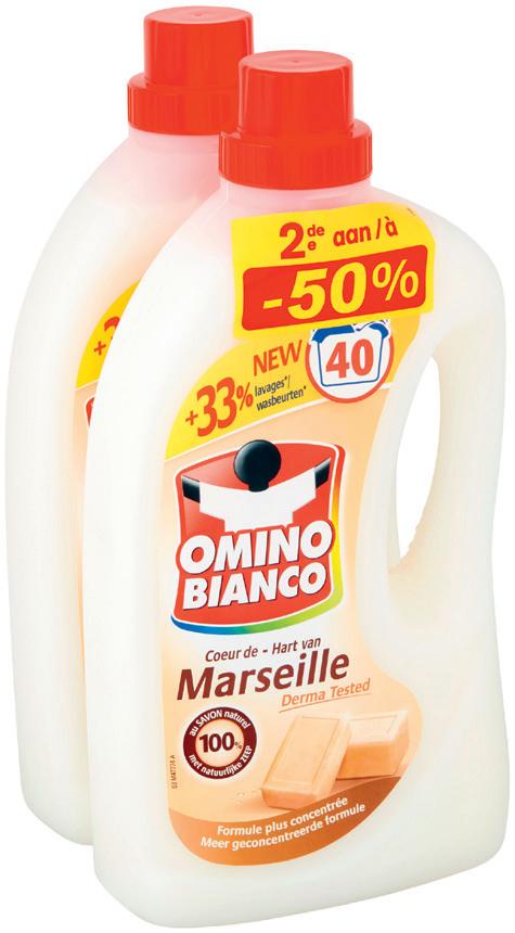 18 4 99 1199 7 98 3 99 2+ 1 GRATIS* Reiniger / Nettoyant C AROLIN Hetgammainpack La gamme en pack Voorbeeld/ Exemple : Vloerreinigeropbasisvanlijnolie Pour sol à l'huile de lin Pack 2 x 1 L Normaleprijs/ Prix normal 2 x 1 L : 10,10 € WC NET Hetgammainpack La gamme en pack Voorbeeld/ Exemple : Wc-gel/ Gel WC Javel White Fresh Pack 2 x 750 ml 2,66 €/L Normaleprijs/ Prix normal 2 x 750 ml : 7,30 € LISTERINE Allevariëteitennaarkeuze Toutes variétés au choix 3 x 500 ml 5,32 €/L Normaleprijs/ Prix normal 3 x 500 ml vanaf/ à partir de 20.37 € Vloeibaarwasmiddel/ Lessive liquide OMINO BIANCO Hart van Marseille / Coeur de Marseille, Nature Fresh en / et Sensitive Pack 2 x 37 dosissen/ doses 0,17 €/dosis/ dose Normaleprijs/ Prix normal 2 x 37 dosissen/ doses : 24,64 € 2 ème à 1/2 PRIX de aan ème à 1/2 PRIJS PRIX 2 ème à 1/2 PRIX de aan