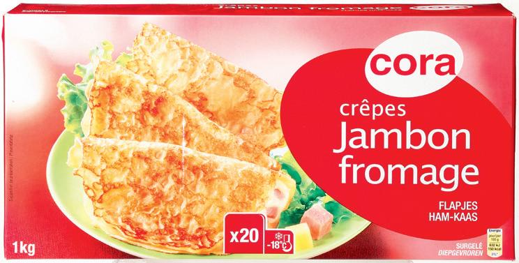 le kg Crêpes CORA Jambon-fromage ou fromage 2 x (20 x 50 g) 4,69 €/kg Prix normal 2 x (20 x 50 g) : 12,50 €