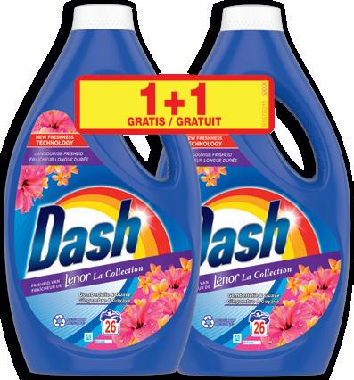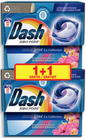 Pods de lessive DASH et ARIEL et lessive liquide DASH La gamme en pack Exemple : Pods de lessive DASH et ARIEL Ginger-Lila, +Unstoppables Color ou +Active Pack 2 x 17-20 doses 0,36-0,30 €/dose Prix normal -2 x 17-20 doses : 29,98 €