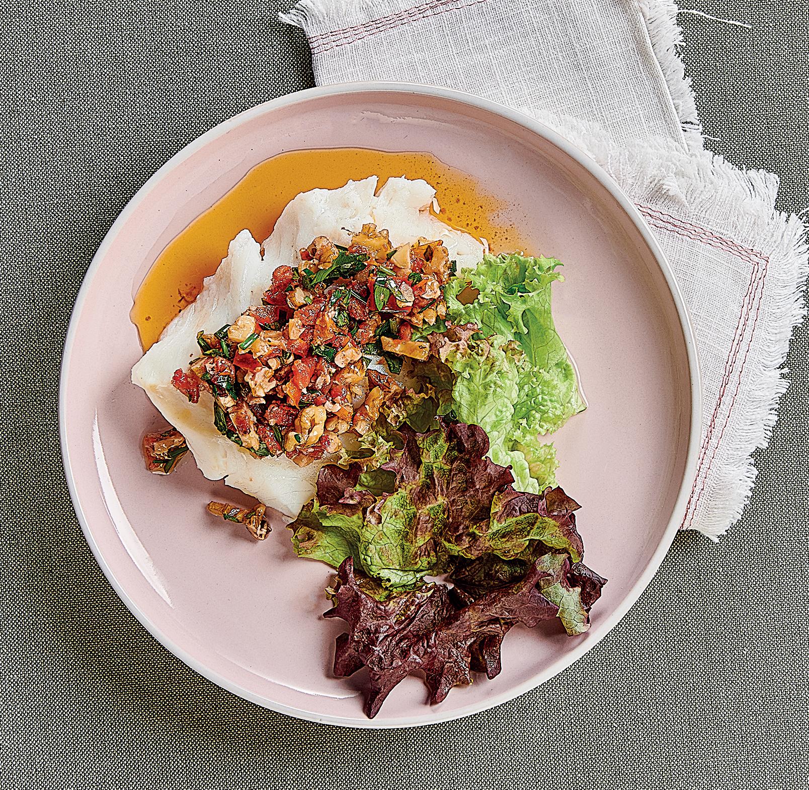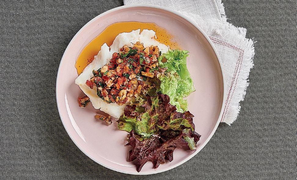 36 300 g de Skrei Persil plat 1 citron Noix concassées Tomates confites finement émincées
