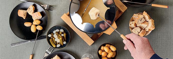 Een met look ingewreven fonduepot waarin je droge witte wijn laat koken en waaraan je vervolgens een fijne mengeling van stukken kaas op het toppunt van hun smaak toevoegt: dat is het geheim van een goede kaasfondue.