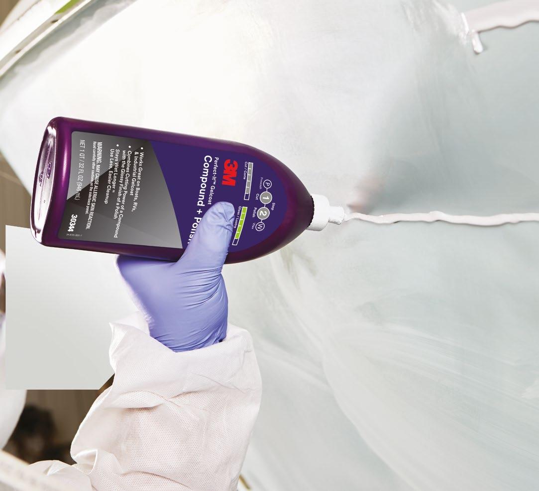 3M™ Perfect-It™ Gelcoat Compound + Polish combines fast cutting power with a high gloss finish. 3M’s new gelcoat compound plus polish is designed for helping to remove light oxidation and P1000 and finer scratches on gelcoat surfaces; while its improved formula has longer wet times for easier cleanup and less dust, even in warm climates.
