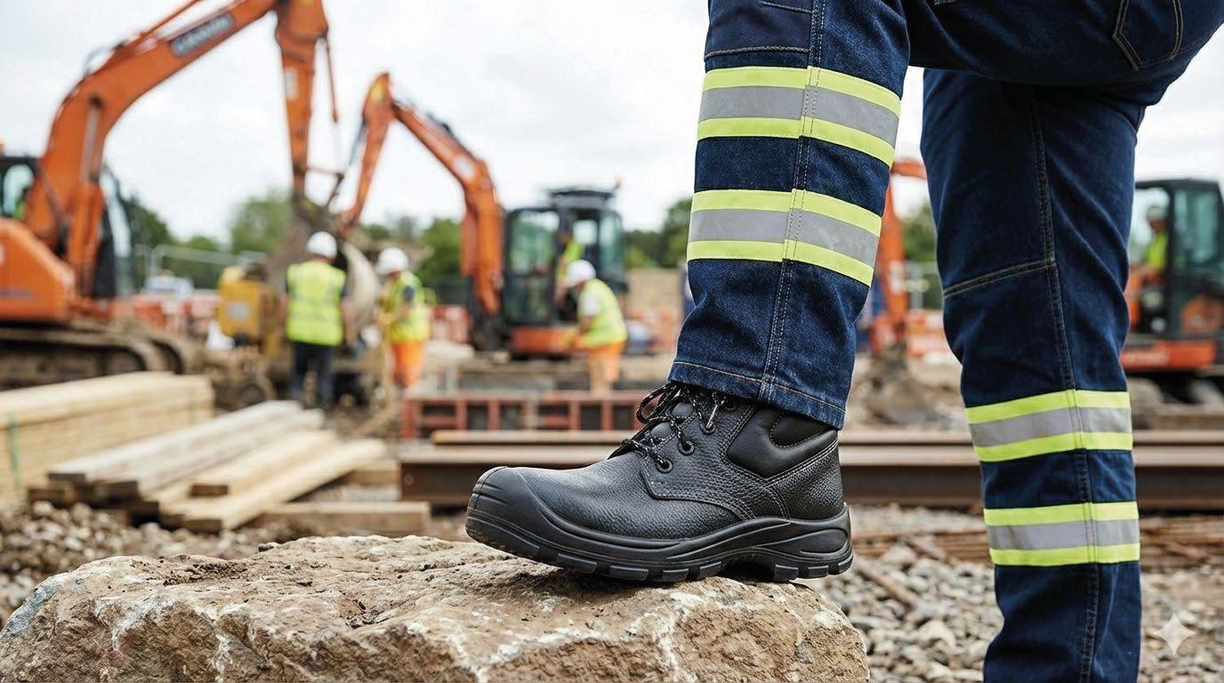 Botín de protección hecho de cuero vacuno con ajuste por cordón, punta de acero, plantilla de acero y suela de doble densidad para uso en diversos ambientes de trabajo.