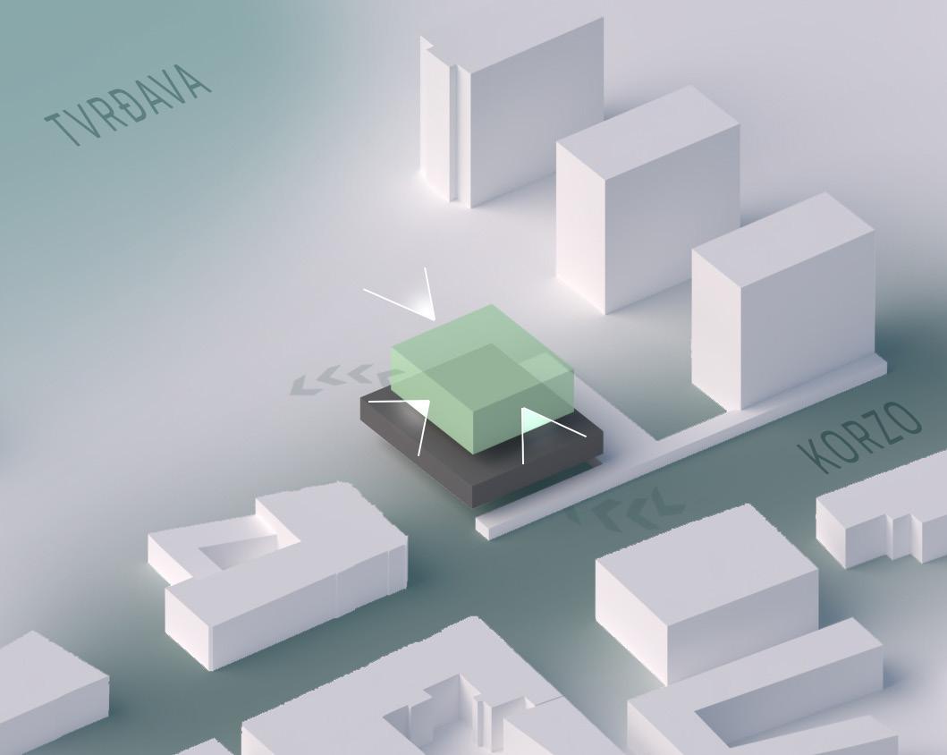 Prizemlje je transparentno, dok je korpus zgrade obložen glatkim poliranim kamenim pločama.