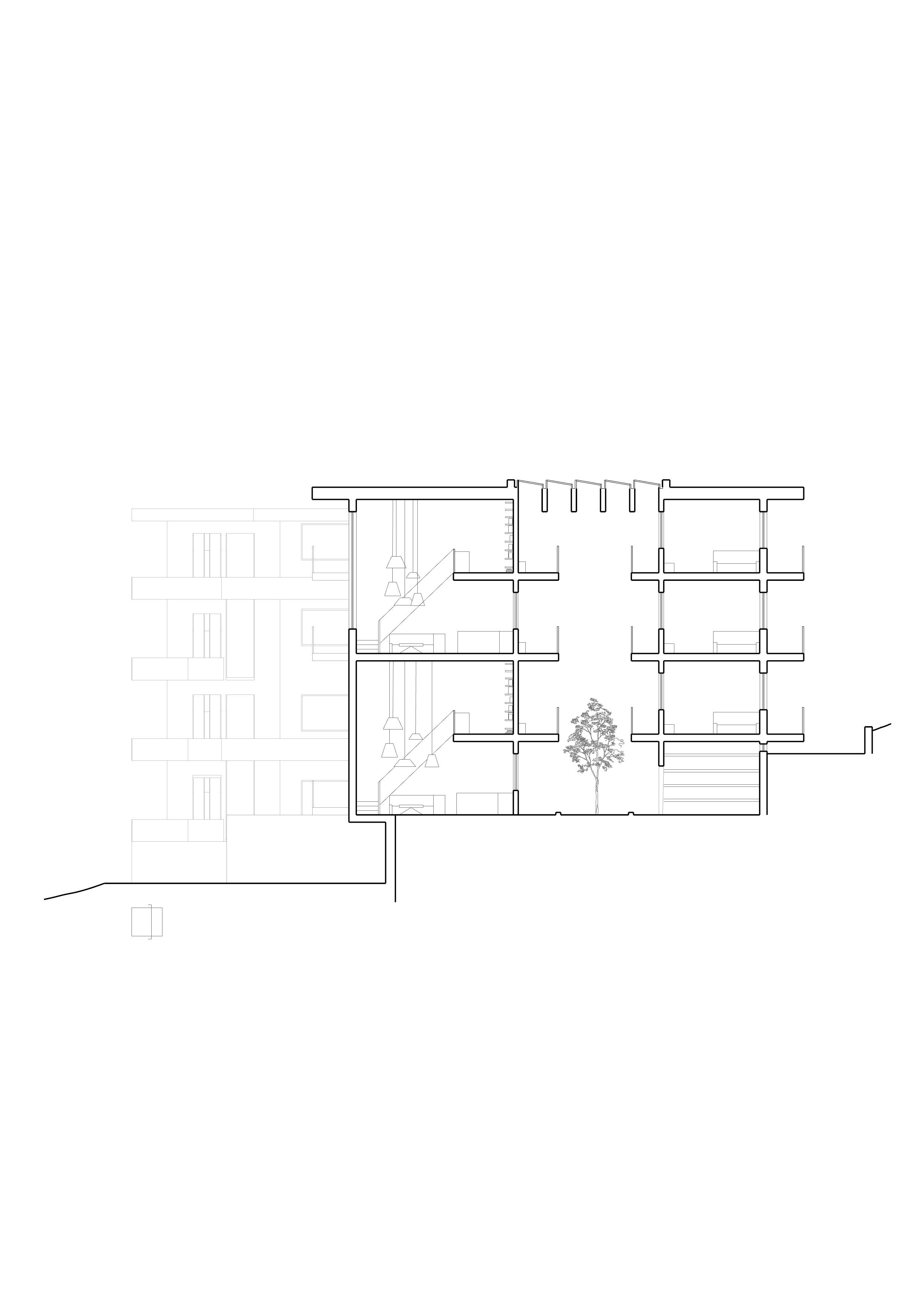 Una galería estructurada en torno a un gran vacío vertical introduce luz cenital y articula las circulaciones como espacios de relación. La estructura de madera y la conexión exterior entre los edificios refuerzan una arquitectura cálida, clara y orientada al encuentro