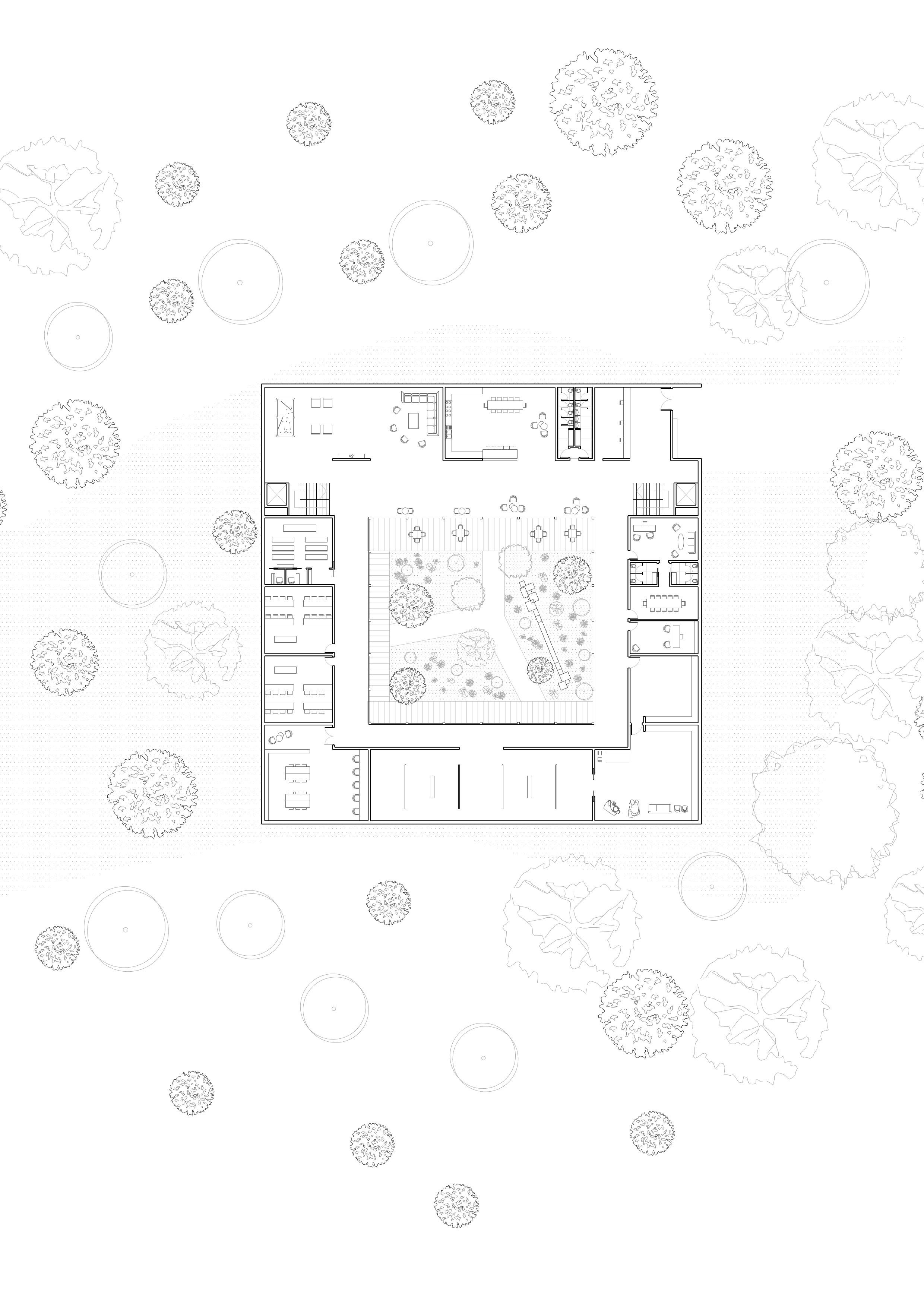 La propuesta parte de una geometría clara, un volumen cuadrado organizado en torno a un gran patio interior que reinterpreta la tipología del claustro como espacio articulador de la vida comunitaria.