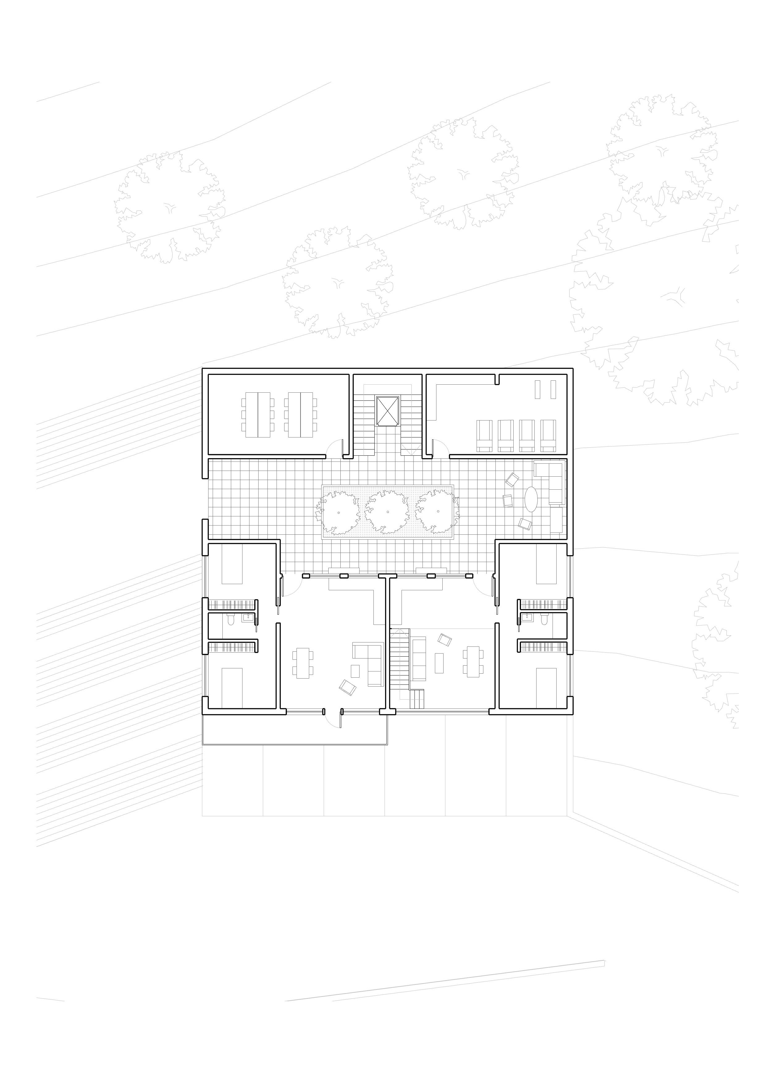 Esta acuarela surge durante el desarrollo del proyecto y forma parte de la construcción del espacio. A través del dibujo se van definiendo decisiones, probando relaciones y dando forma al patio como elemento central, dejando ver la atmósfera que termina caracterizando la arquitectura.