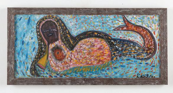 458. Agathe Aladin (Haitian, b. 1967) Simbi, Goddess of Fresh Water, 2009, acrylic on canvas. Framed. Size: 24'' x 30'', 61 x 76 cm (stretcher); 25.5'' x 31.5'', 65 x 80 cm (frame). Provenance: Galerie Macondo. $150-300 Start: $125