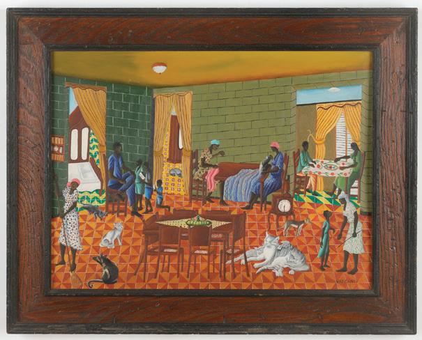 Lot 124. Philome Obin (Haitian, 1892-1986) Hbtion Bayuex, 1957, oil on masonite board. Framed. Size: 15.5'' x 19.5'', 39 x 50 cm (sight); 21.25'' x 25.25'', 54 x 64 cm (frame). Frame by House of Heydenryk. Provenance: Astrid & Dr. Halvor Jaeger, Private Connecticut Collection, John Branca, Esq.