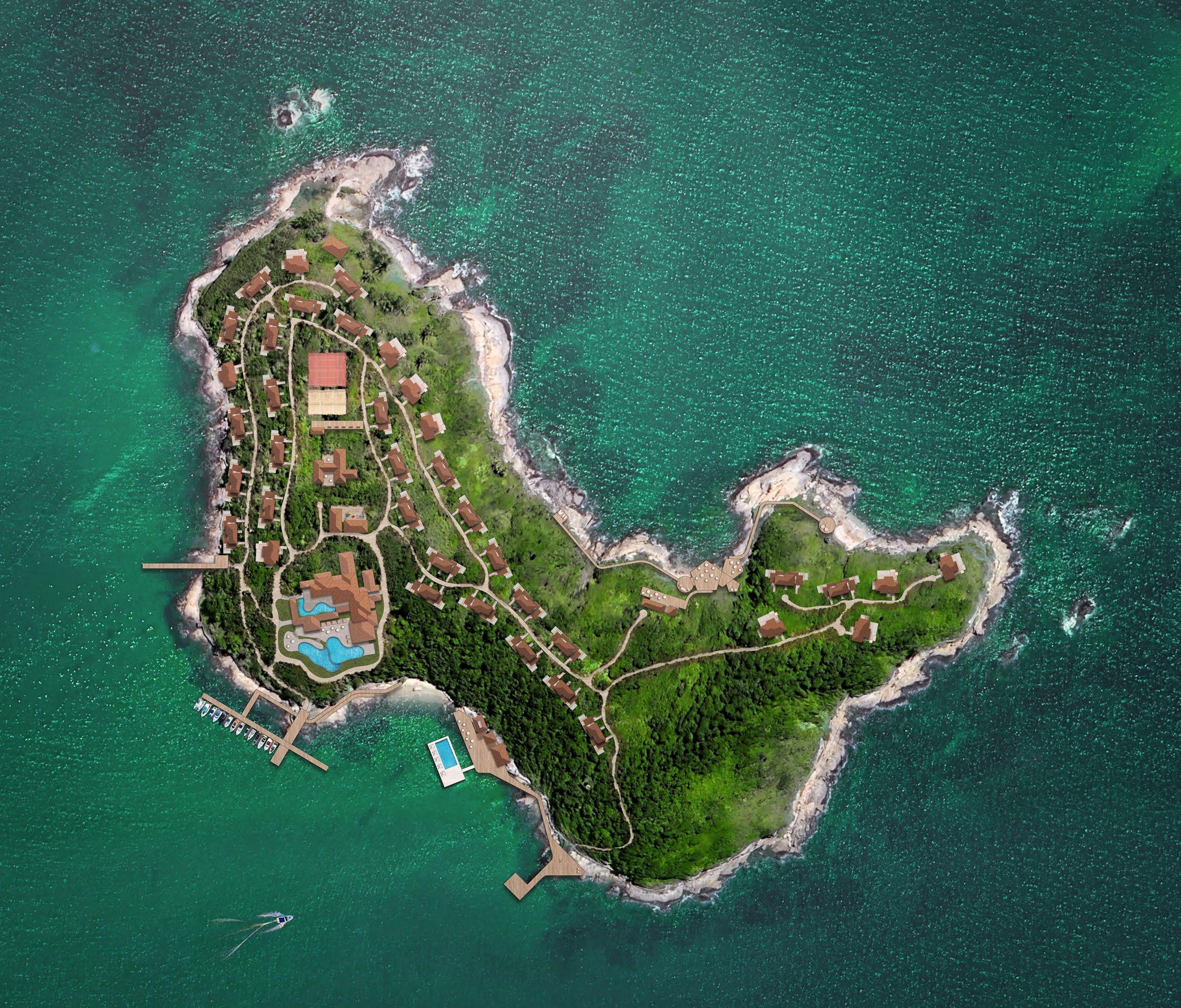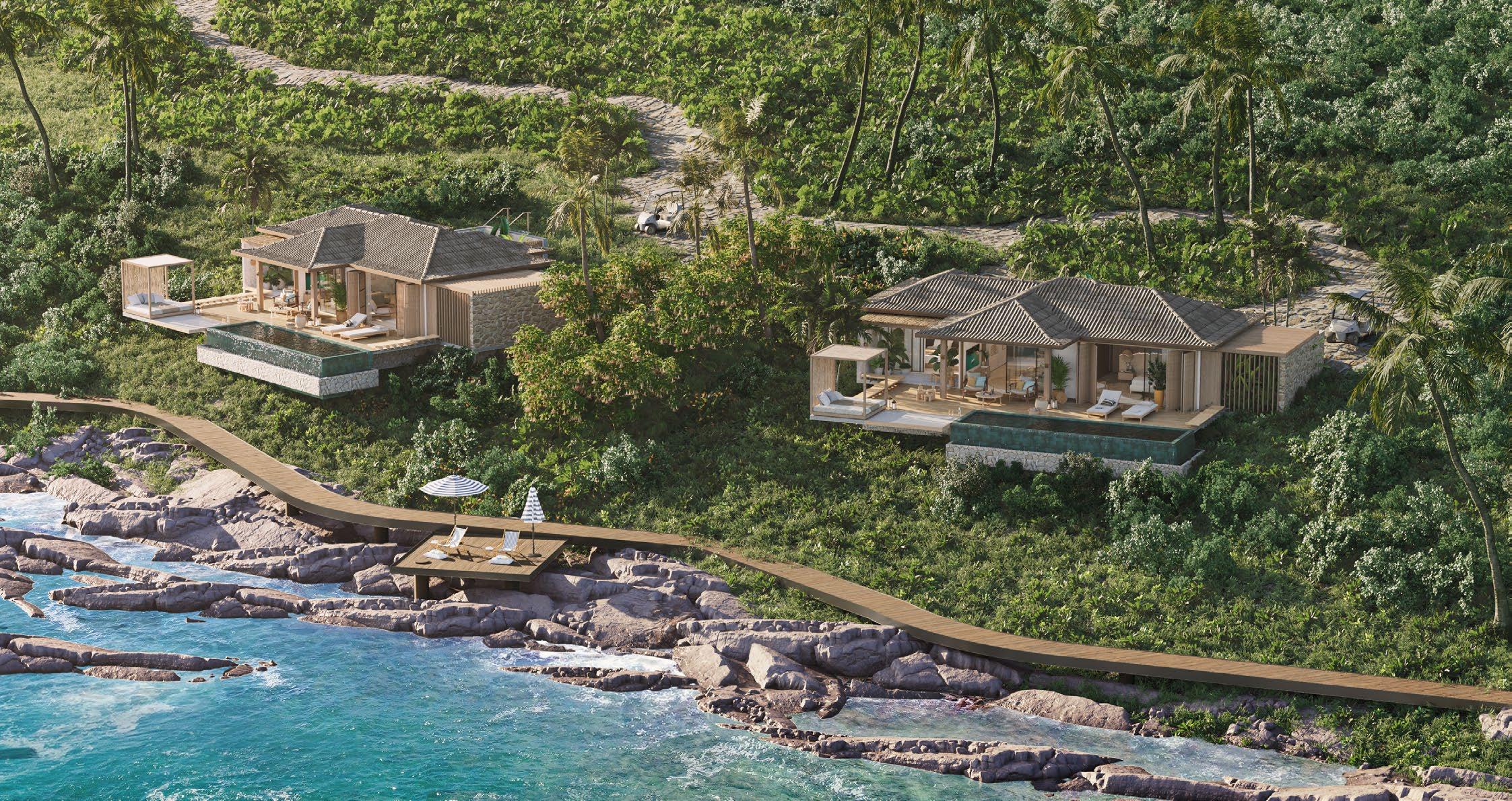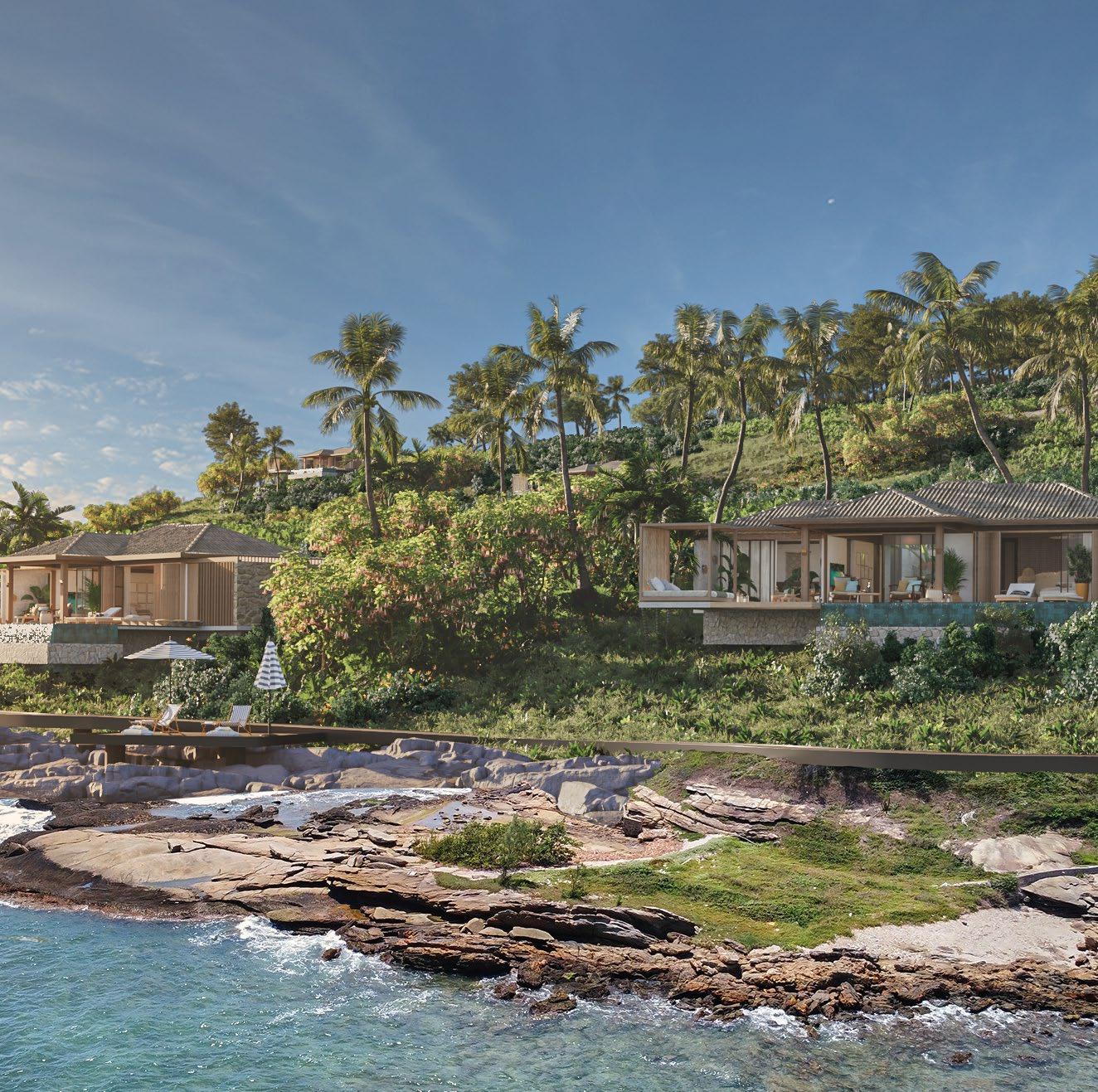 The master plan responds to the island’s dramatic topography and ecological richness. Buildings are carefully placed to preserve existing vegetation and respect the rocky coastal edges. Private bungalows, situated to maximize privacy and ocean views, feature individual pools, decks, and warm, sophisticated interiors that balance simplicity and refinement.