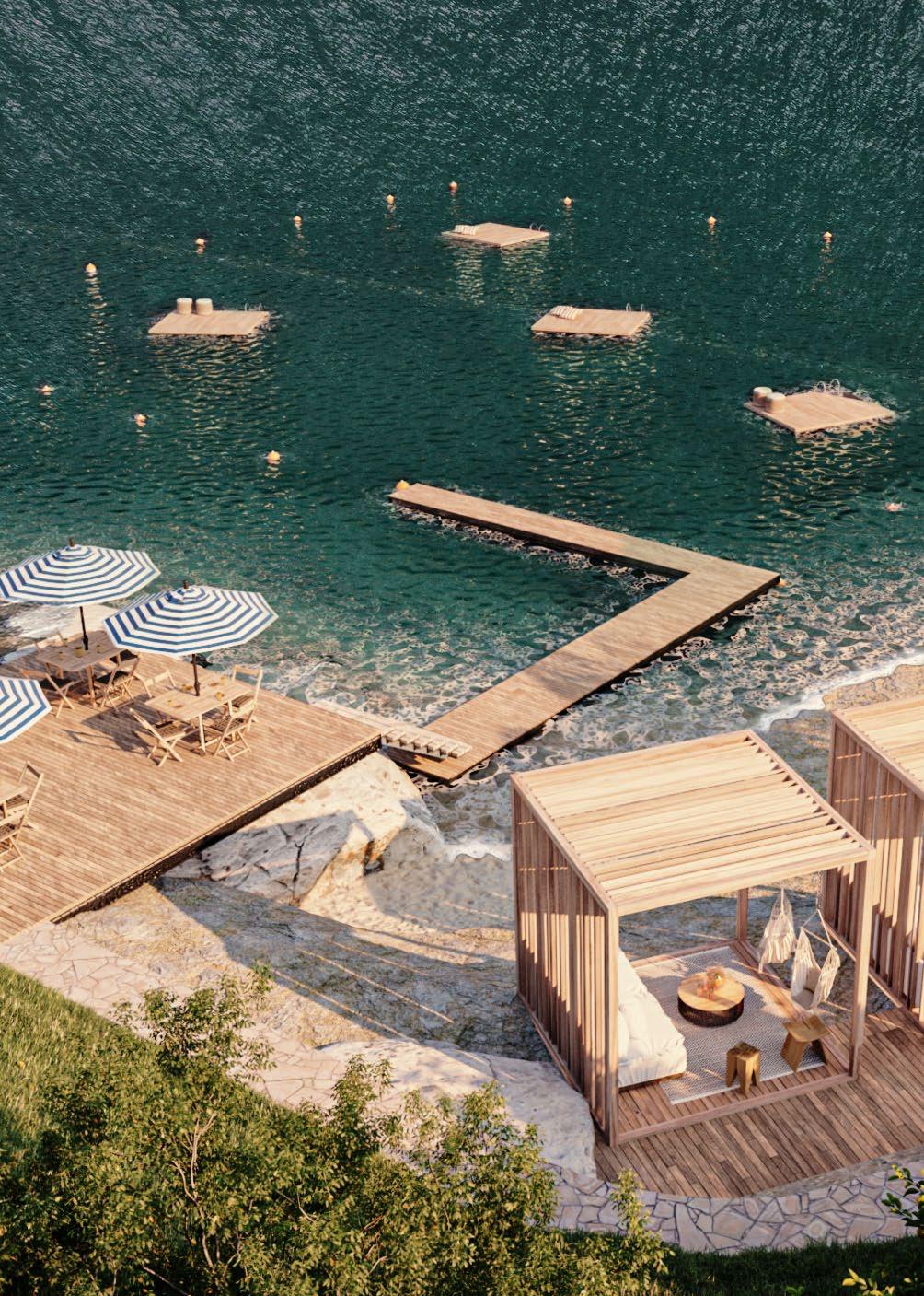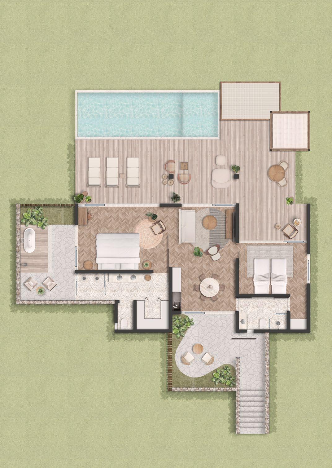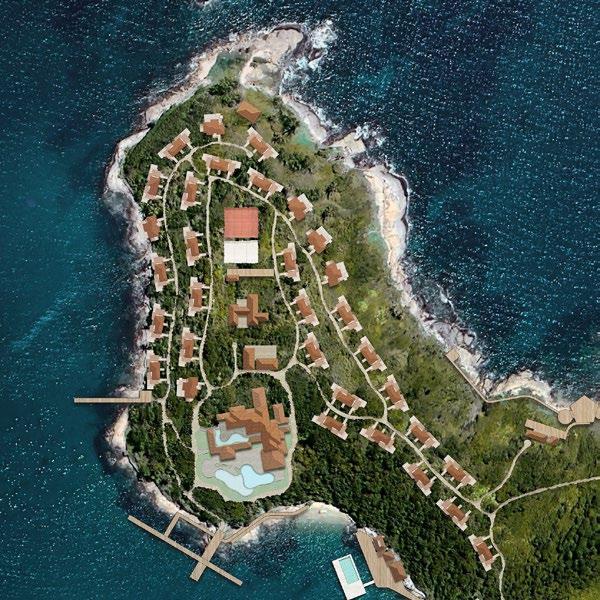 The master plan responds to the island’s dramatic topography and ecological richness. Buildings are carefully placed to preserve existing vegetation and respect the rocky coastal edges. Private bungalows, situated to maximize privacy and ocean views, feature individual pools, decks, and warm, sophisticated interiors that balance simplicity and refinement.