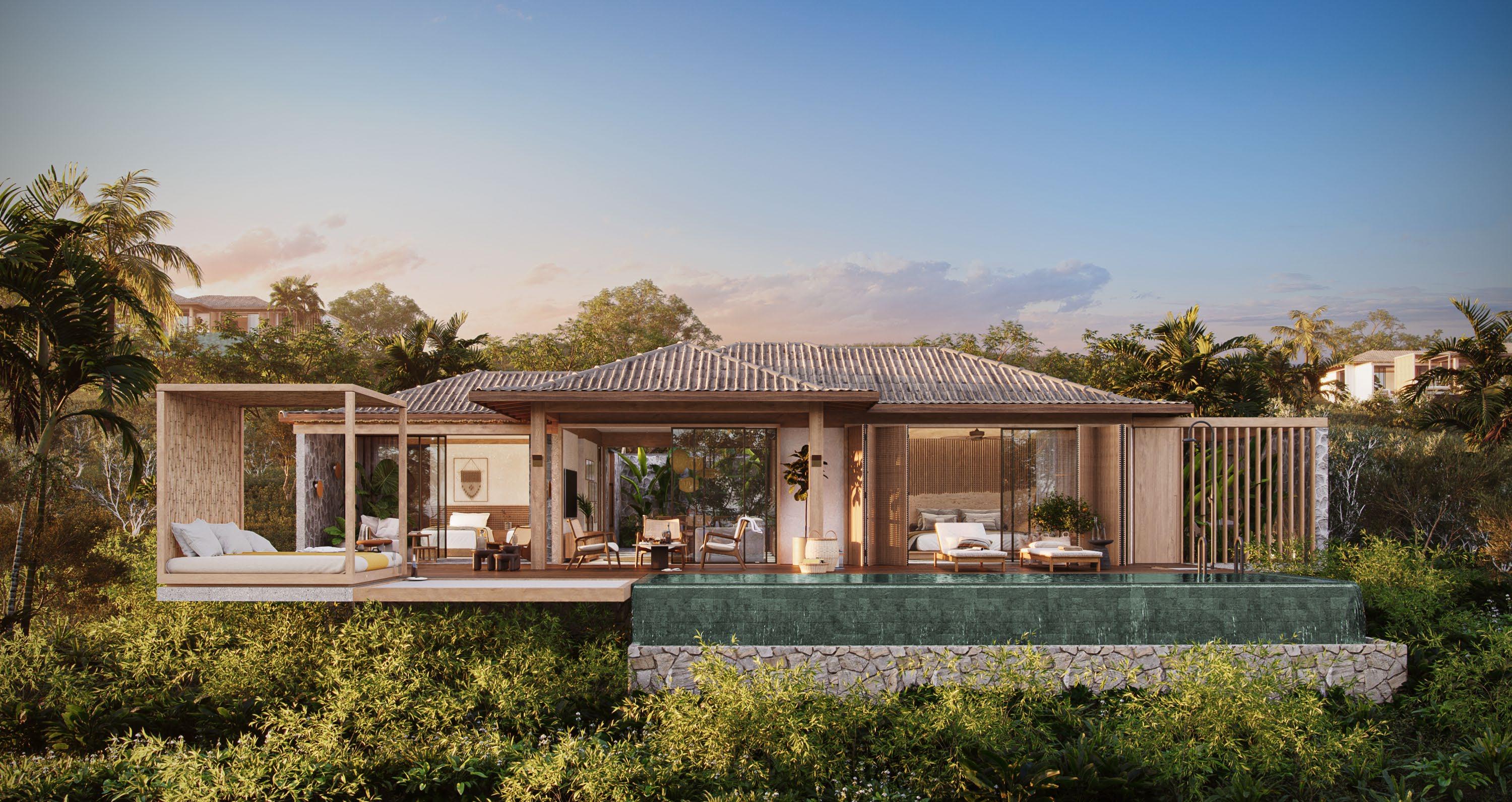Common areas include a beach club with floating pools, thematic bars, and dining experiences curated by chef Alex Atala, blending high-end gastronomy with the resort’s idyllic setting. A phased master plan ensures seamless construction, prioritizing essential facilities like the beach club, sports courts, and a model bungalow in the early stages.