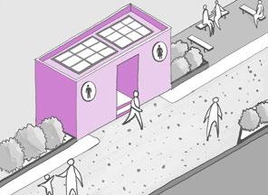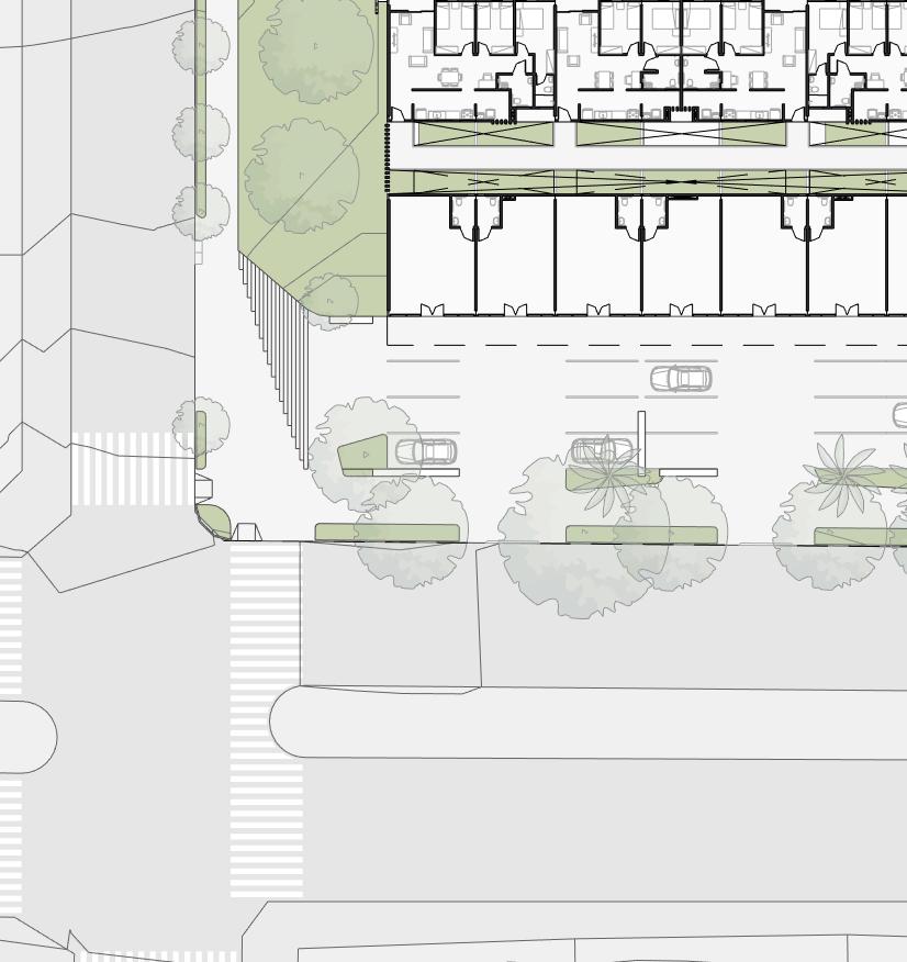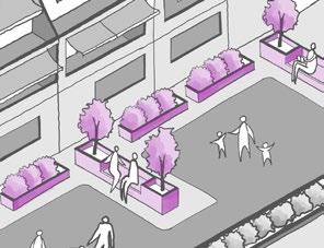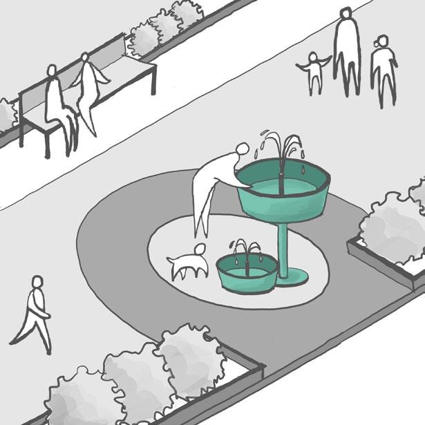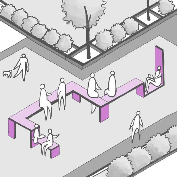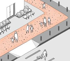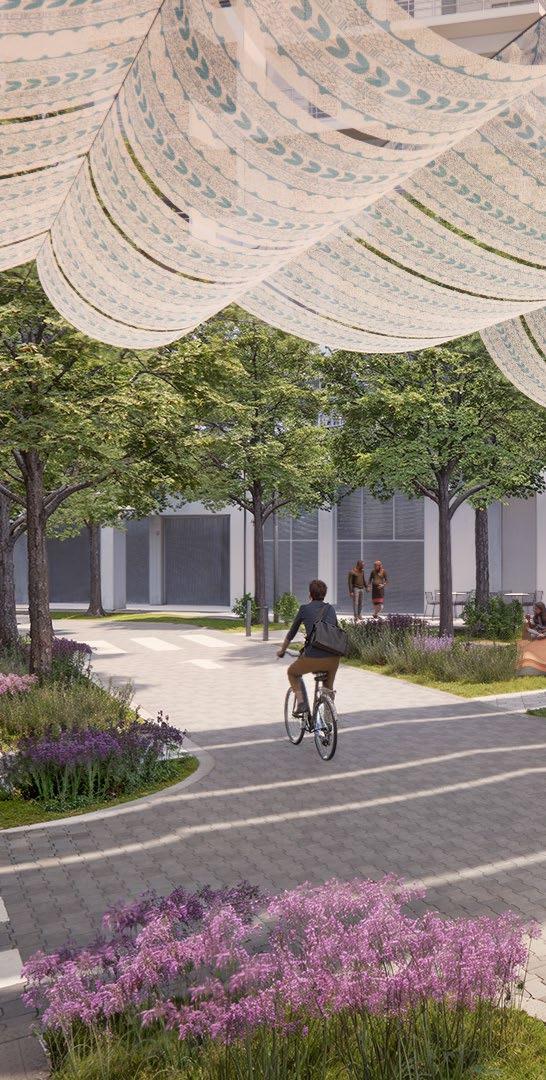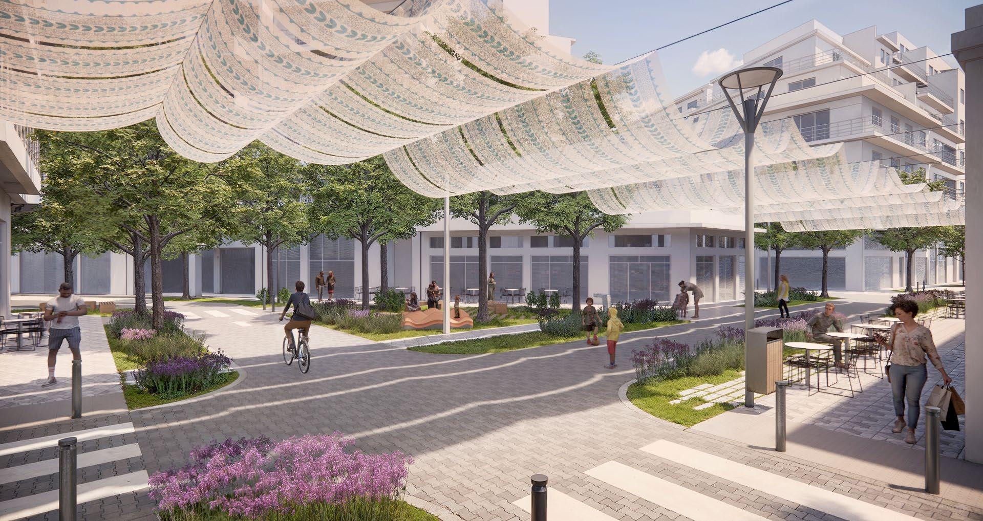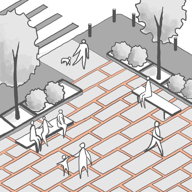 • Green Infrastructure: Shaded seating areas, green walls, and permeable pavements create a welcoming environment while improving stormwater management.