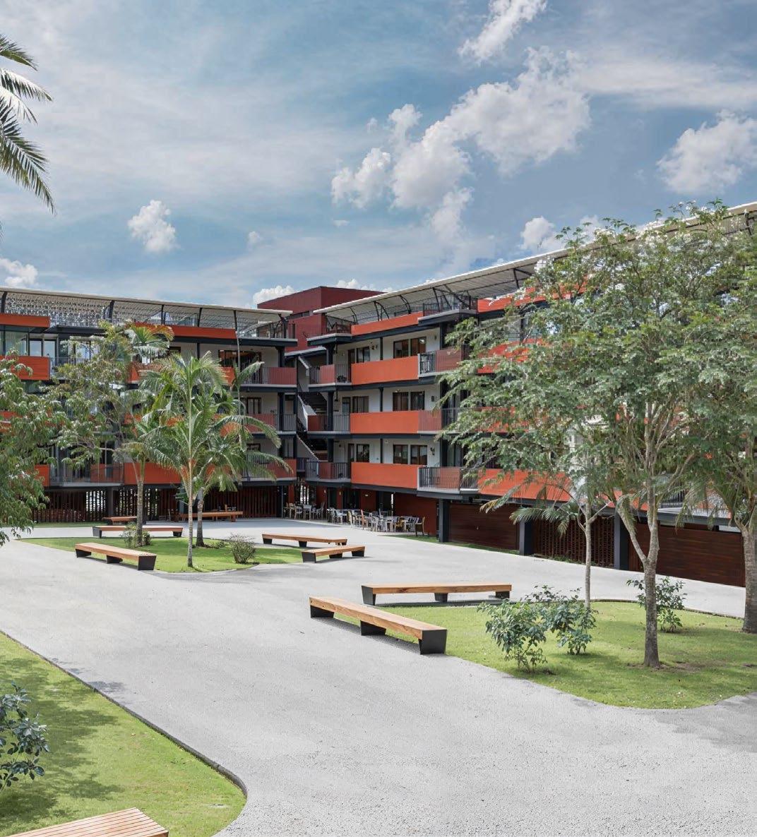 A garden between the buildings offers shaded seating areas and serves as a transition space, blending functionality and leisure.