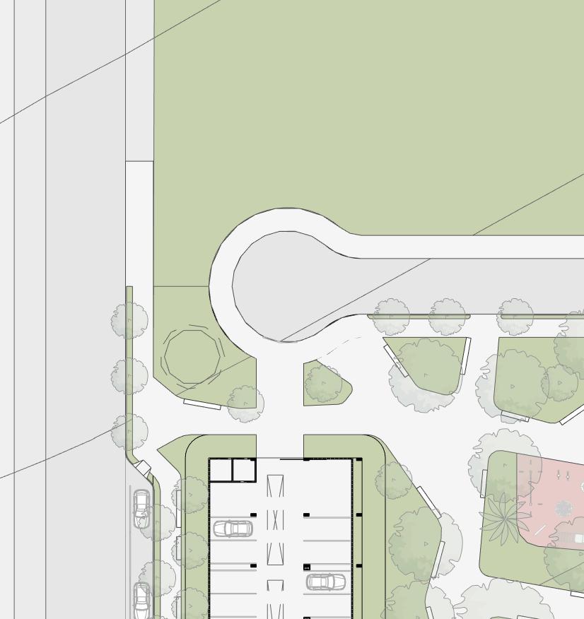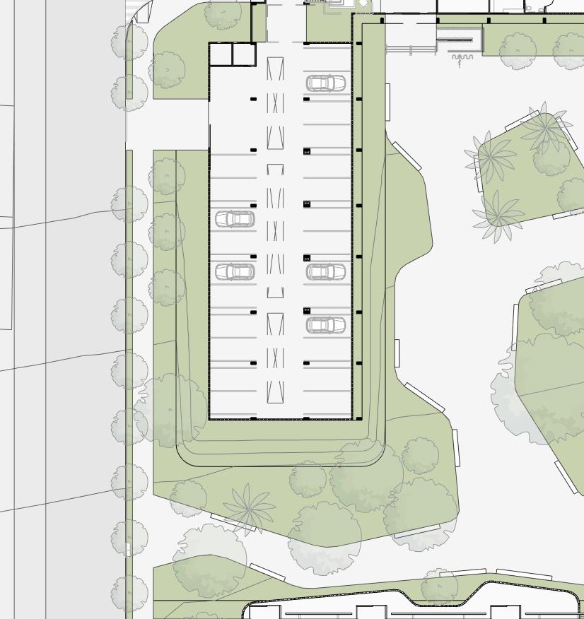 The study balanced the prominence of the notary office with retail visibility on an irregular shape site. A U-shaped layout ensured retail façades were accessible while maintaining the office’s hierarchy. Strict zoning regulations, including parking and footprint constraints, were addressed with an underground parking solution and open-air parking areas. Collaborative planning allowed tenant-specific needs to integrate seamlessly into the design, achieving a functional and cohesive result.cohesive result.