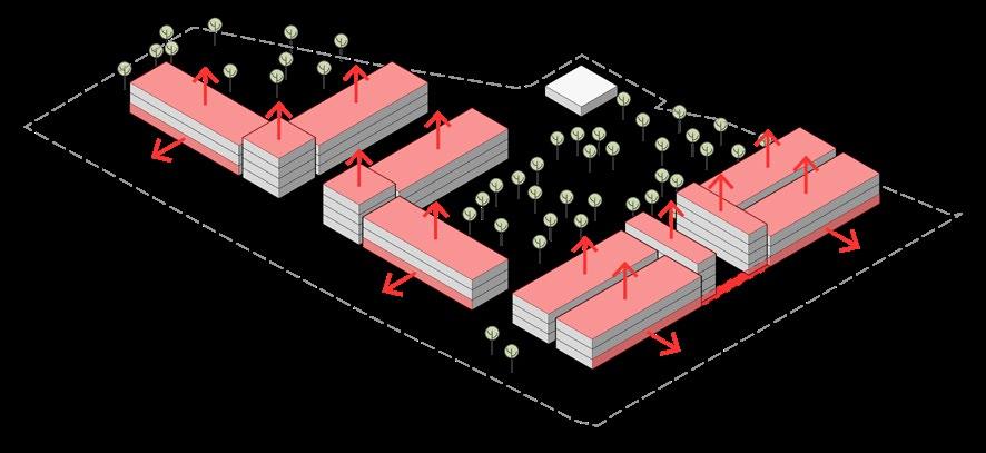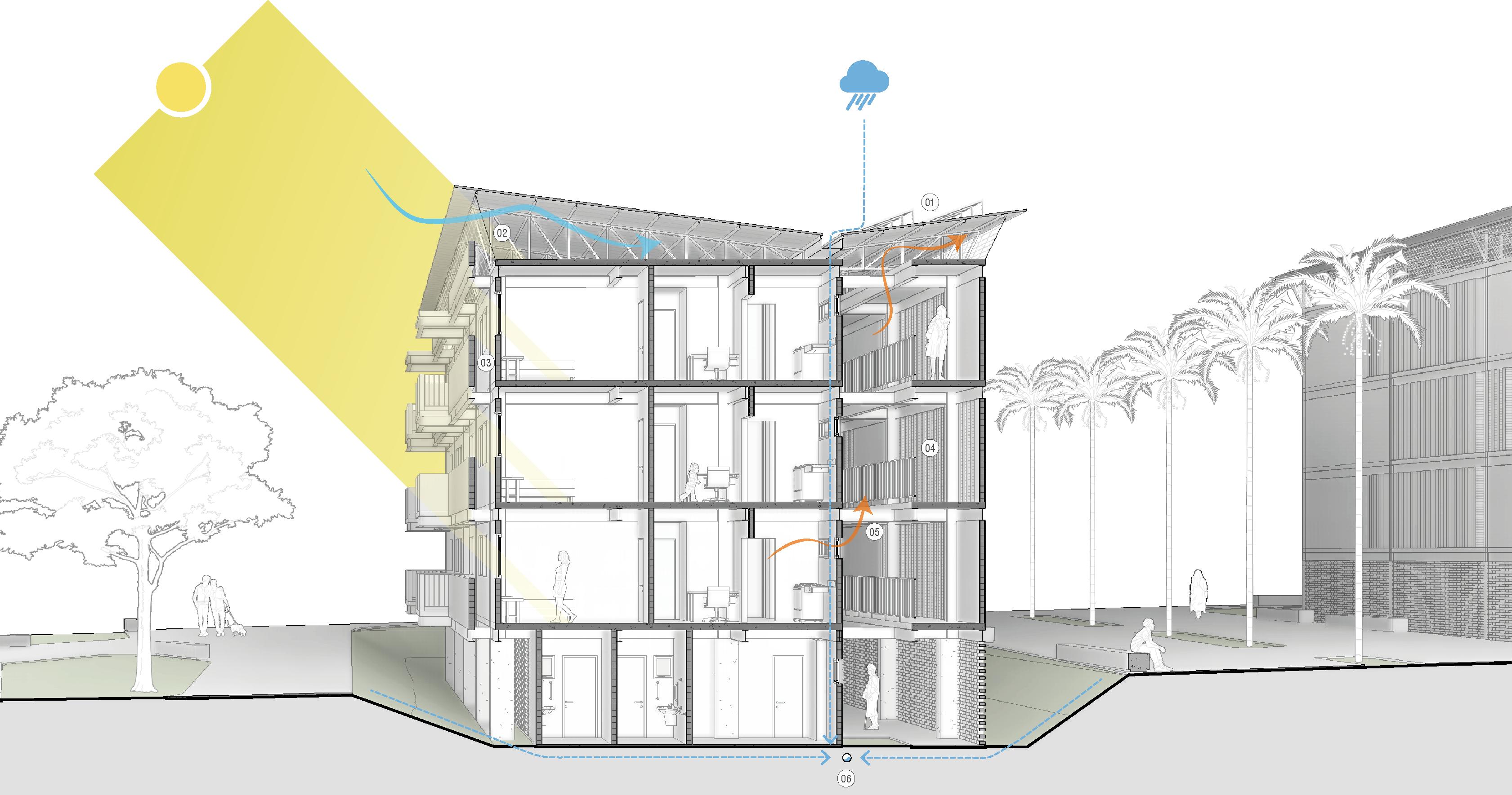The design prioritizes accessibility and comfort for both office and retail users. Communal spaces, including the courtyard and rooftop, are designed to encourage interaction while providing tranquil areas for rest and events. The use of natural materials like wood, combined with shading elements, creates a welcoming and energyefficient environment.