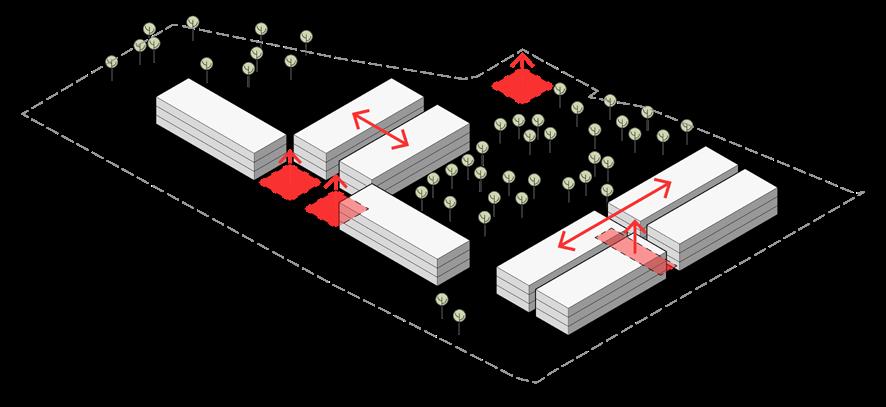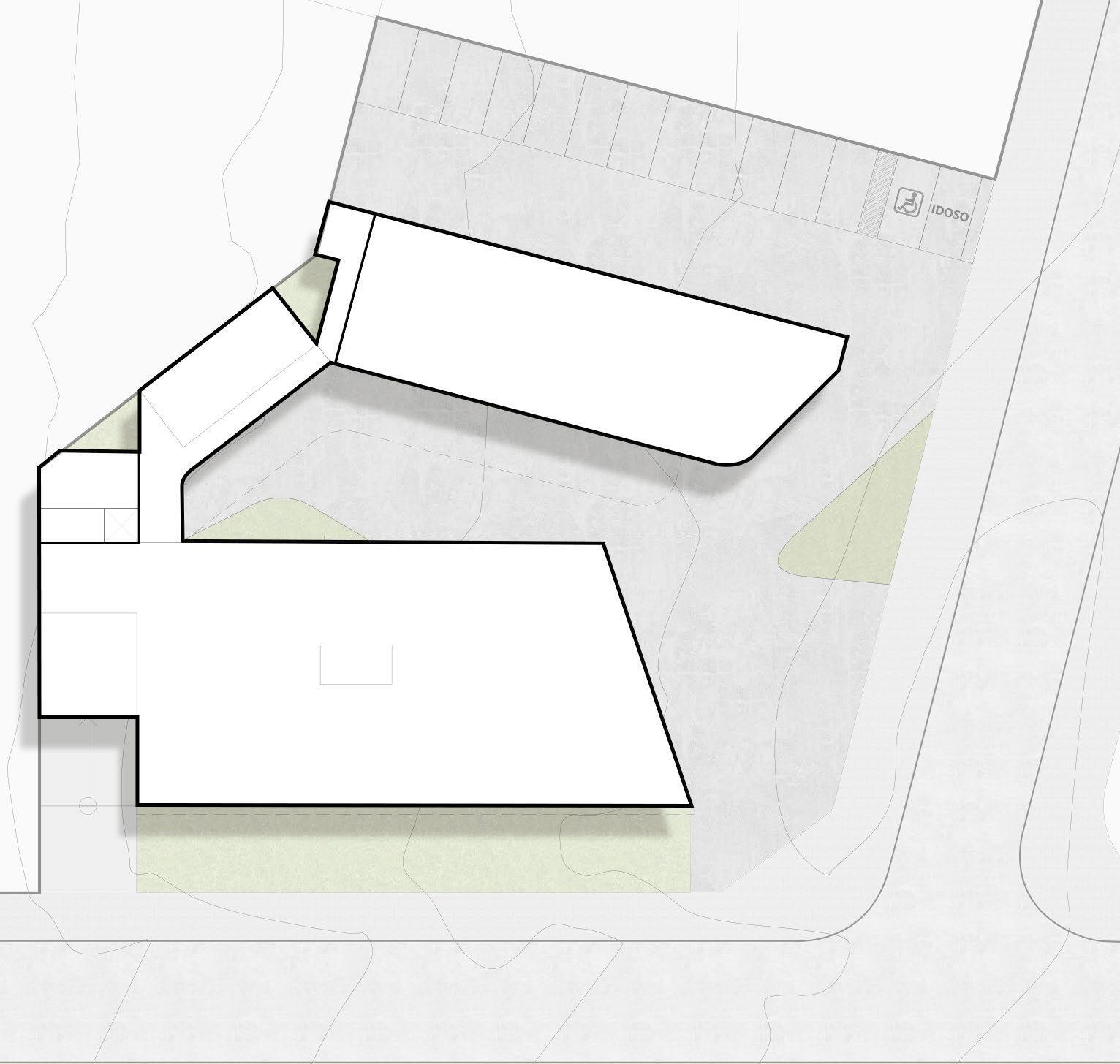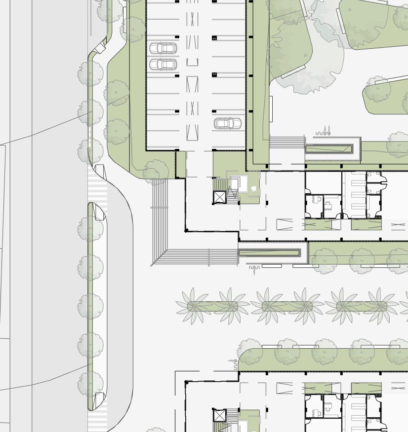 • Retail Spaces: Located along the secondary street, the retail building spans two floors and is connected to the notary office by a covered corridor and a pergolashaded courtyard.