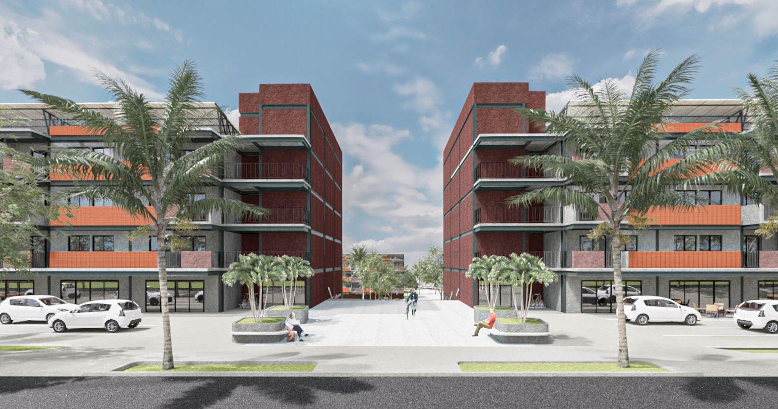 Located on a corner lot in a rapidly developing area, the project needed to address visibility for retail spaces, zoning regulations, and parking requirements. By incorporating underground and ground-level parking and adhering to a 50% site coverage limit, the design meets these constraints while maintaining functionality and aesthetic quality.