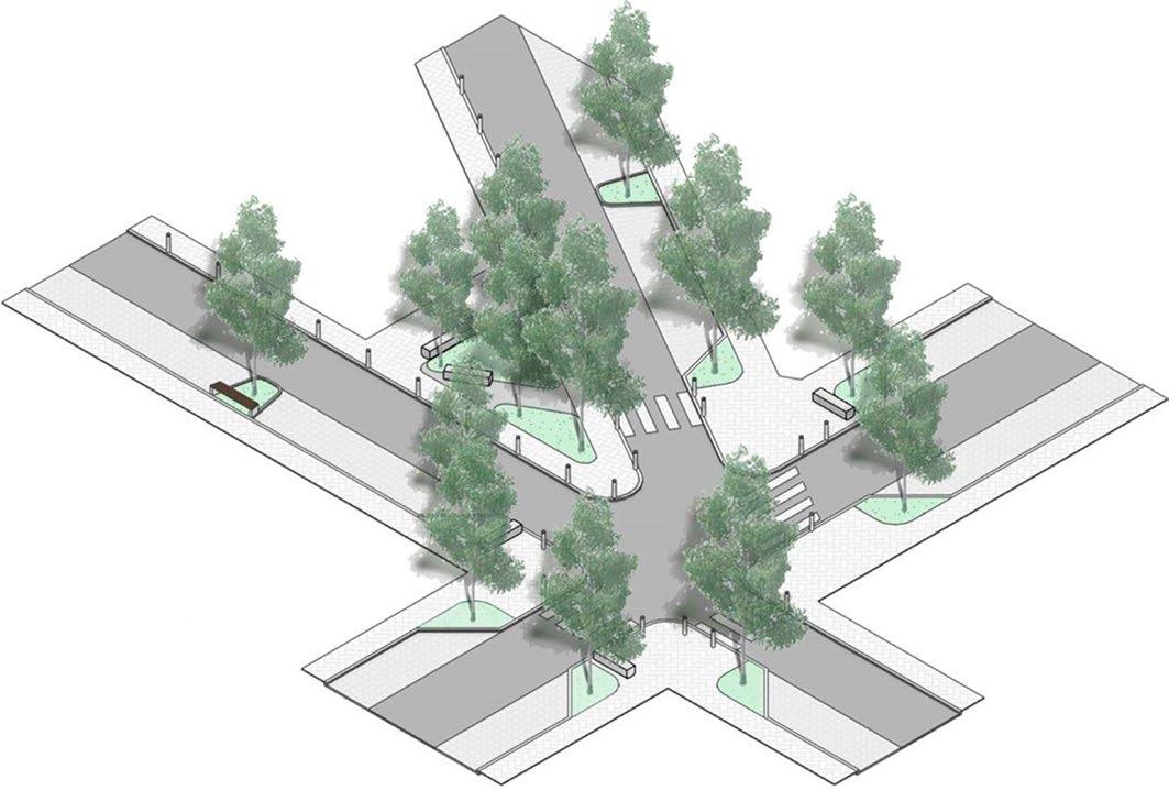 • Intersections: Redesigned as social-ecological hubs, integrating shaded seating, water features, and modular urban furniture. In Kypseli, intersections play a vital role in fostering interaction and serving as cooling nodes.