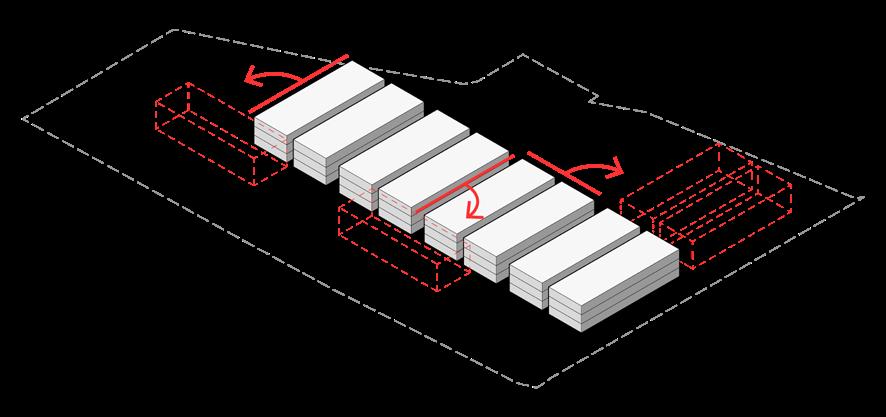 • Ground Floor: Divided into seven retail spaces, including a 930 sqm anchor store, with large storefronts facing the main avenue. A metal canopy with a wooden ceiling, supported by diagonal steel pillars, shelters the openair hallway and creates a striking visual feature.