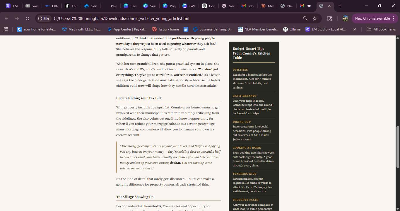 With gas prices climbing, grocery bills stretching further than ever, and property tax bills landing in mailboxes this week, many households are feeling the squeeze. Connie Webster Young a longtime resident and retired bank employee known for her grounded, no-nonsense wisdom sat down with me to talk honestly about what families can do right now to protect themselves, teach their children well, and look out for one another
