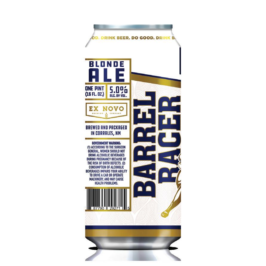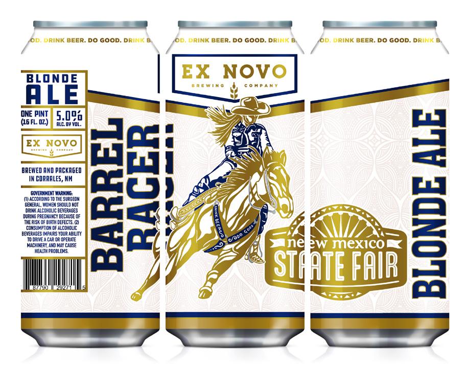 The term “barrel racer” takes on new meaning at the New Mexico State Fair this year, as that’s the name of the 10-day event’s official beer for 2024. Corralesbased Ex Novo Brewing Co. has produced Barrel Racer Blonde Ale, identifiable by its striking gold and navy cowgirl graphics running across a white can.