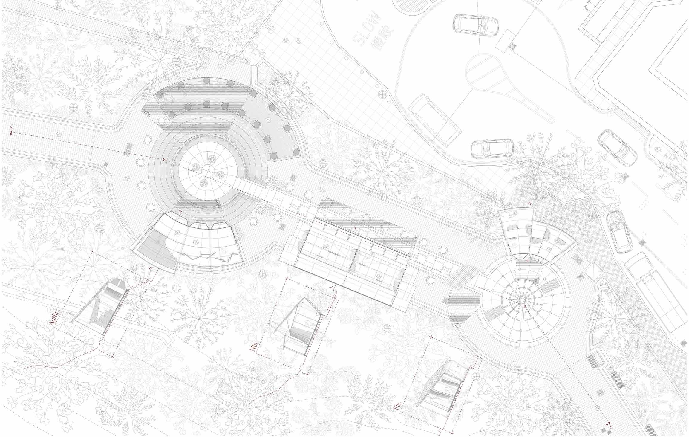As an inbetween point of both water feature knodes. The Intervention encounters and highlights the natural elements that are of abundace and variety along the migration space. Making use of the sloped greeneries and canopies of the cliffed mountain side, followed with the traveling stream of water passage. The Intervention slanted on both ends, projects the external natural elements onto the internal surfaces. Playing with the axis aswell, the typically horizontal water stream is projected as a vertical element, while vertical canopy and greenery are projected onto the flooring and ceiling of the space. A series of sliding screens furher add layers to the projected elements.
