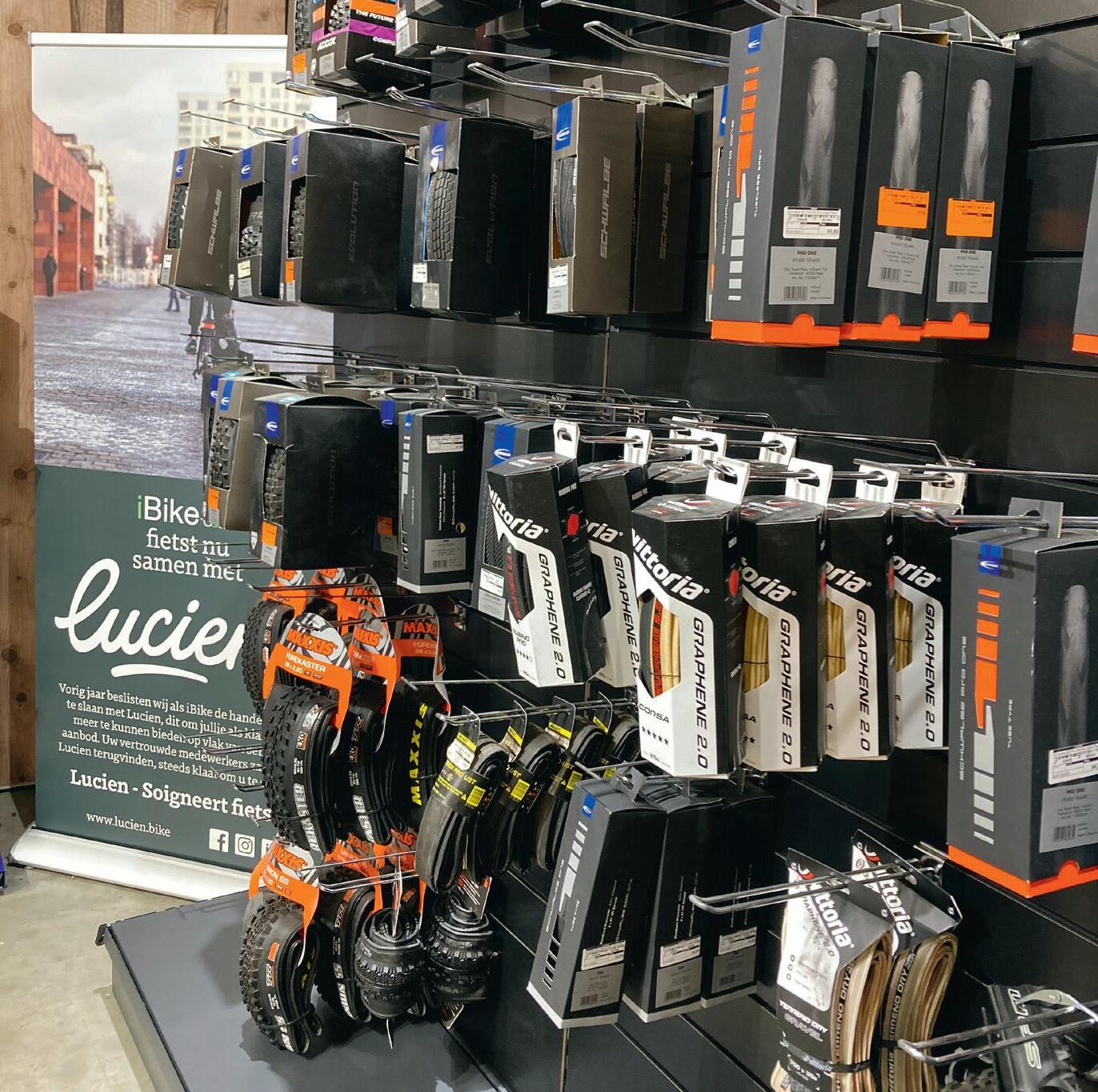 de fietskledij en de schoenen van Shimano ruiken en voelen, maar ook fietshelmen van Lazer, zadel- of stuurpennen, fietspompen of fietstassen van Pro. Je vindt er sturen, schoenplaatjes, klikpedalen, tot en met speciale e-bikeschoenen met een platte zool die een beetje stijf is... Van Tourorganisator ASO mag het Center sinds vorig jaar trouwens ook aan de Tour de France gelinkte parafernalia verkopen. Kortom, een ware snoepwinkel. Dat Shimano in het profpeloton een grote naam is, merk je aan de fietsen van profploeg DSM, de Pinarello-fiets van ex-Tourwinnaar Egan Bernal en de gele Canyon van Mathieu van der Poel; die gesofisticeerde, vederlichte machine kreeg hij toen hij de gele trui droeg. Bijzondere aandacht ook voor Philippe Gilbert, vier keer winnaar van de Amstel Gold Race en in 2012 wereldkampioen bij de profs in... jawel, Valkenburg.