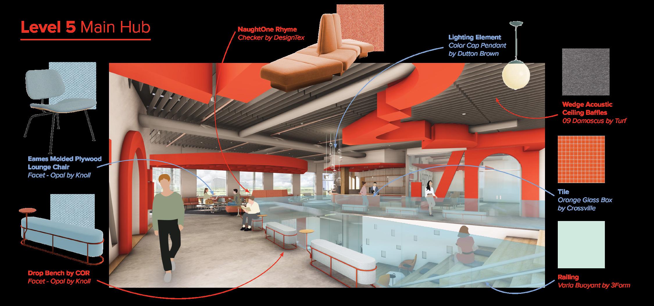 This project tackled the continually evolving challenge of workplace design. This concept for Abridge, a healthcare technology company that uses generative AI to transcribe patient/clinician conversations, translates their ideology into a physical space. Across two levels, the office balances public-facing and private functions while prioritizing employee well-being and productivity. Workstations line the perimeter to maximize natural light, while offices, meeting rooms, and huddle spaces are carved into the central core to support both focused and collaborative work. Brand elements such as Abridge’s signature orange, waveform-inspired forms, and acoustic felt features reinforce identity while creating a comfortable, flexible, and engaging workplace.
