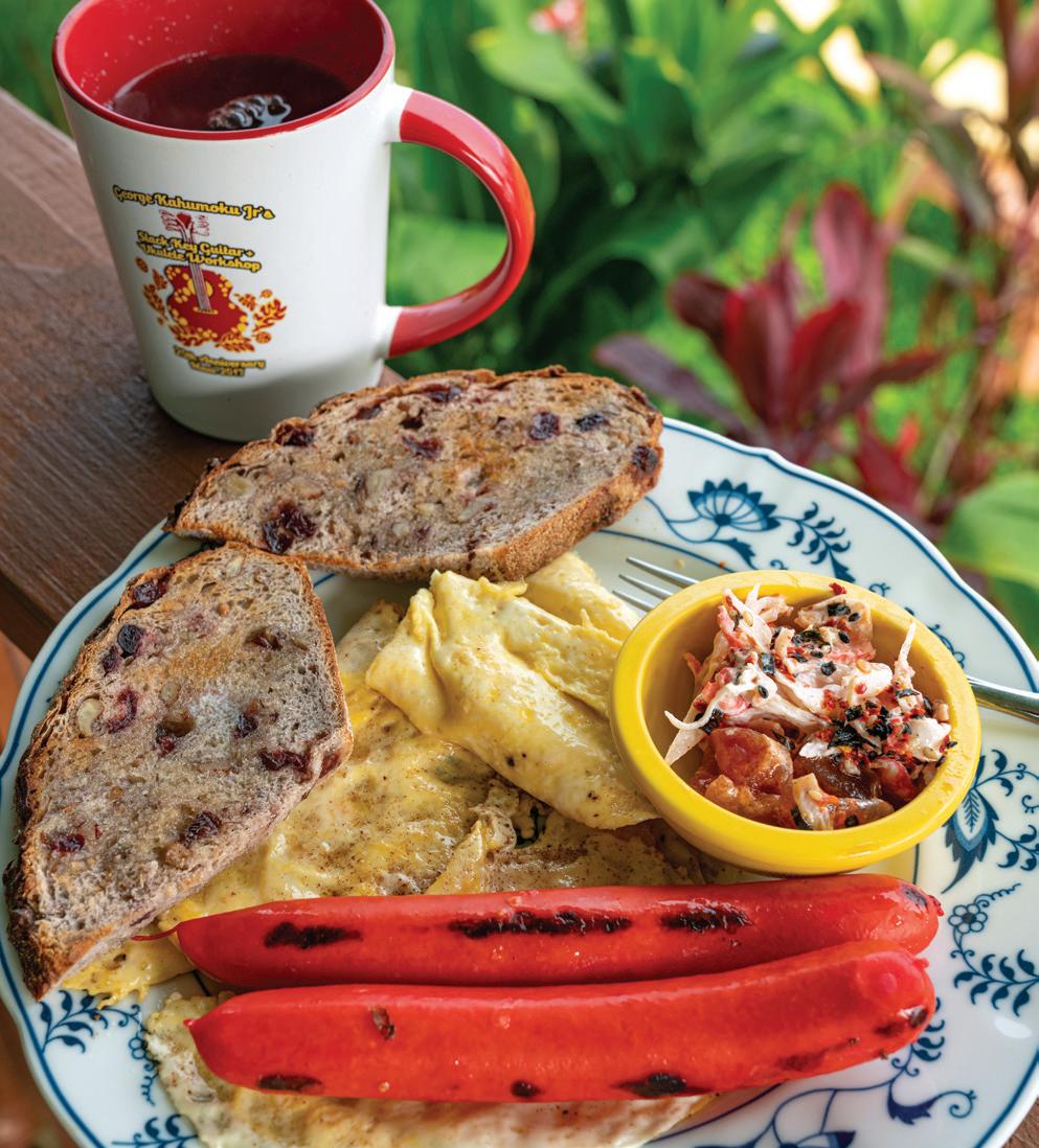 Take out a breakfast like French toast or scrambled eggs with Portuguese sausage. Midday, get a burger or mahimahi plate lunch to-go. Pacific Rim. B, L, $