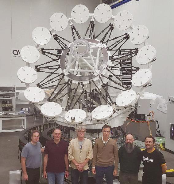 Team members show off a model of their advanced ELF telescope in the Canary Islands.