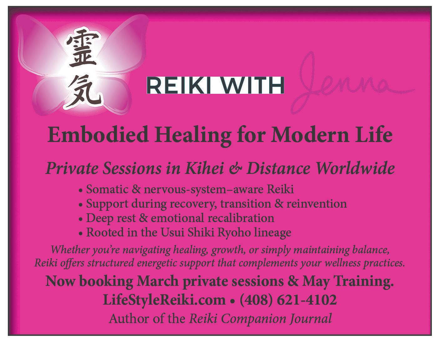 Sat., April 4 - Haiku - Reiki Level 1 - Full Day Training: Begin your Reiki journey by learning foundational energy healing techniques to support yourself and others while developing deeper intuition and healing abilities. Info at: GoGetitEnergyhealing.com
