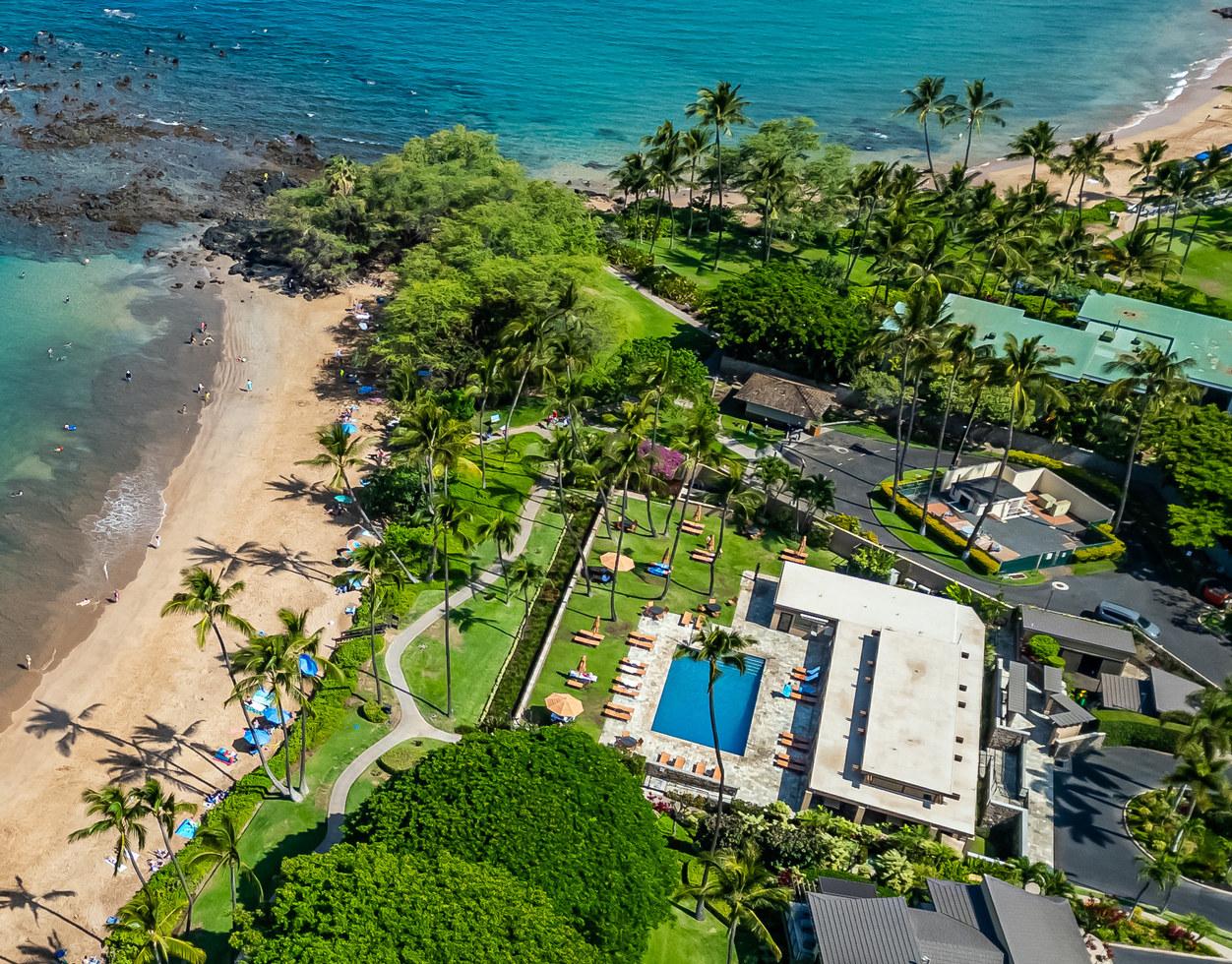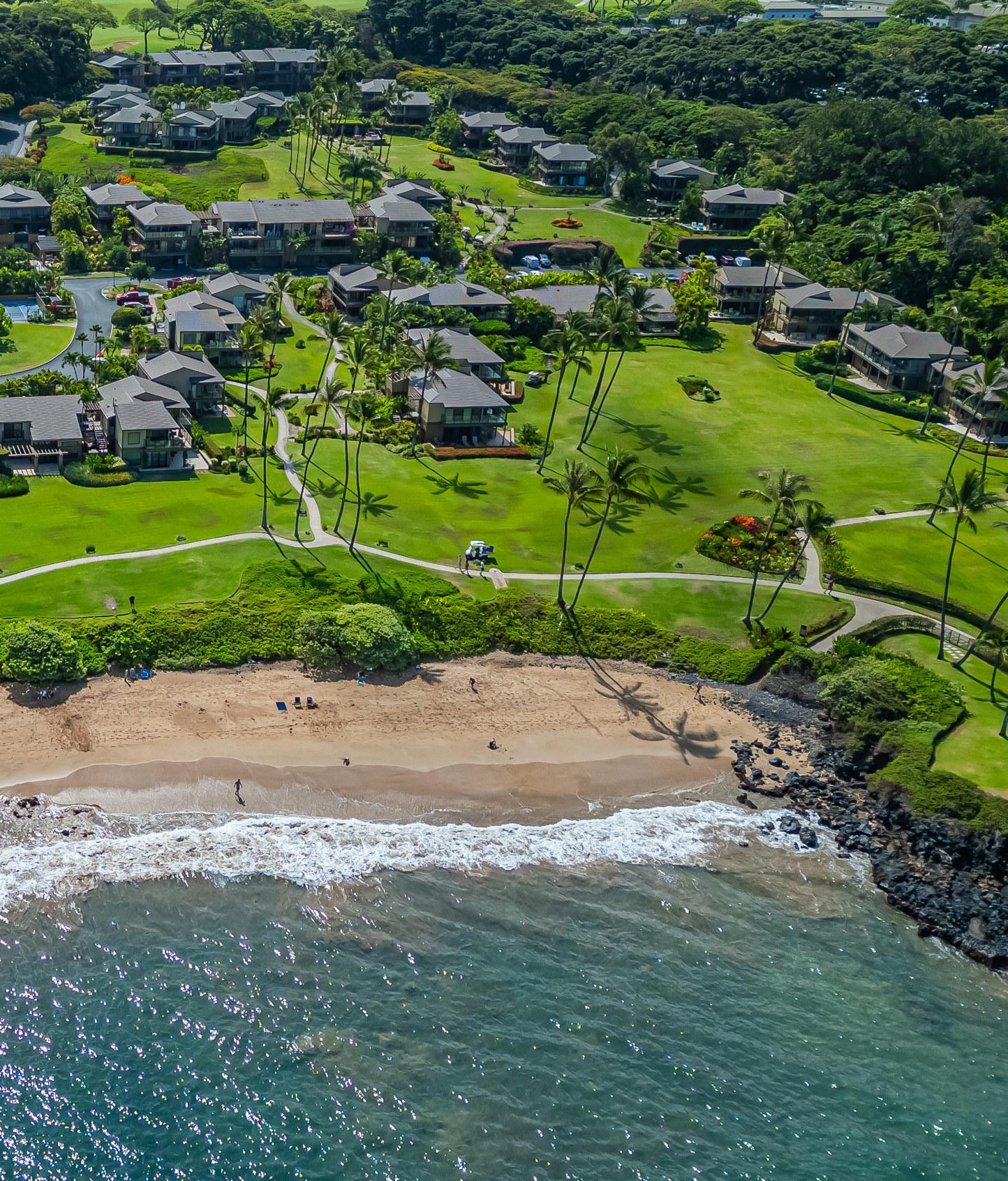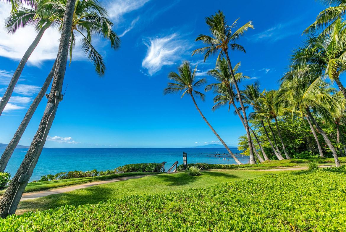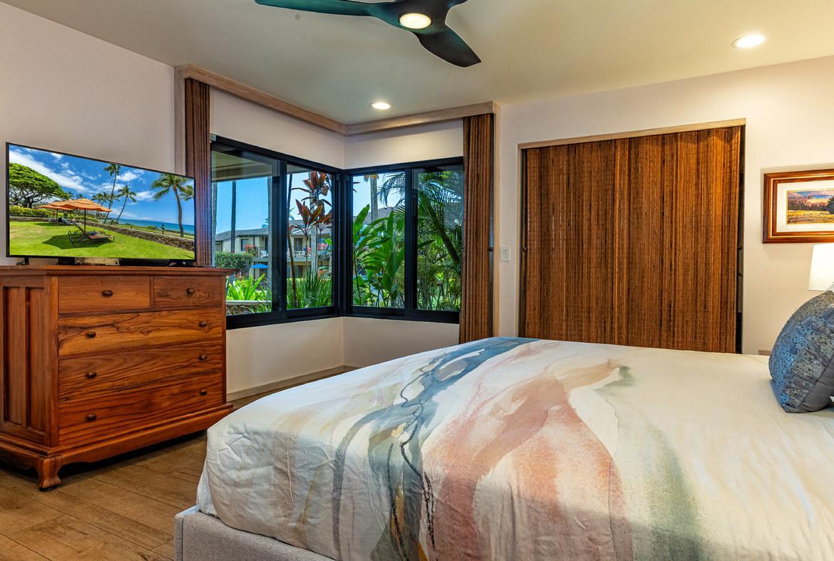 Wailea Elua is a revered, Hotel Resort Zoned, 24-acre Oceanfront veritable Garden of Eden! This World-Class low-density property enjoys an unparalleled amount of direct ocean/beach & ‘Wailea Walkway’ frontage! It is 1 of 2 esteemed guard-gated Wailea condominiums & its owners value a loyal historic following of returning vacationers. Elua 1101 was lovingly & comprehensively renovated in 2018. Throughout the open & spacious floor plan, there is luxury vinyl wood-like flooring & ceiling sound insulation. The light-filled interior is enhanced with recessed LED gallery-quality lighting. Fine quality ‘Western Windows’ & Sliding Doors replaced all the original infrastructure. A lovely juxtaposition of clean, contemporary, & eco-friendly natural organic elements are featured. Stunning natural grain Douglas Fir wood doors & vertical, book-matched, blond bamboo cabinetry are contrasted with Hans-Grohe brushed stainless steel fixtures, & the fabulous patterns & textures of the specimen silver-grey-white granite counters & full-height backsplashes. Noticeable are the extended vertical granite counter-fronts in the kitchen & bath. Bosch stainless steel appliances include an induction cooktop & an under-mount Vigo sink that fit seamlessly into this chef’s kitchen. The scale of the book-matched specimen granite shower surround, the whirlpool tub, the handblown glass door pulls, the spun-stainless steel under-mount sinks, & even the choice of the brushed stainless steel shower head filter, allude to an intentional designer’s touch! Within sight of all this, the glistening LG-Eco washer/dryer speaks of another intentional design element. There is on-demand filtered hot water! The numerous ‘Haiku Fans’ are the finest in the industry & assist the central AC system with climate control! Lying in the king-size bed, enjoy the 2 adjoining corner windows that afford a lovely ocean view through the lushly landscaped green-belt & the oversized covered lanai, which is perfect for lounging or alfresco dining! There is also an abundance of closet & storage space in Wailea Elua 1101. The world-class Shops at Wailea, 3 magnificent golf courses, a tennis/pickleball center, Michelin-starred gourmet restaurants, & Maui’s finest beaches are at your fingertips! Sold Turn-Key Furnished! MLS # 402591