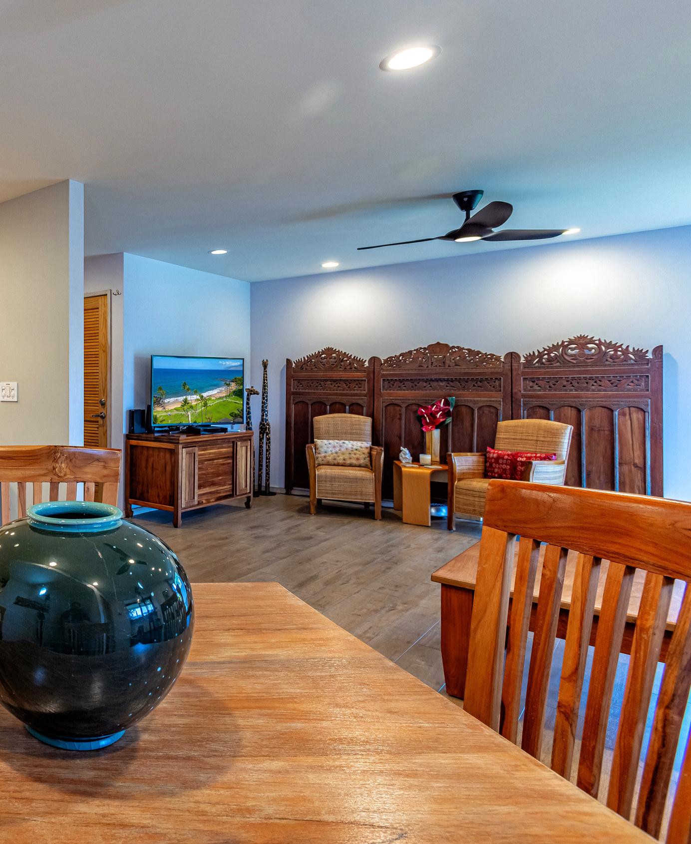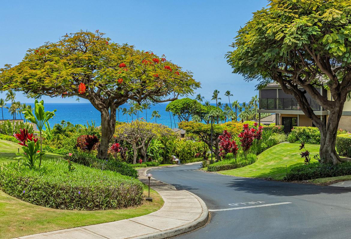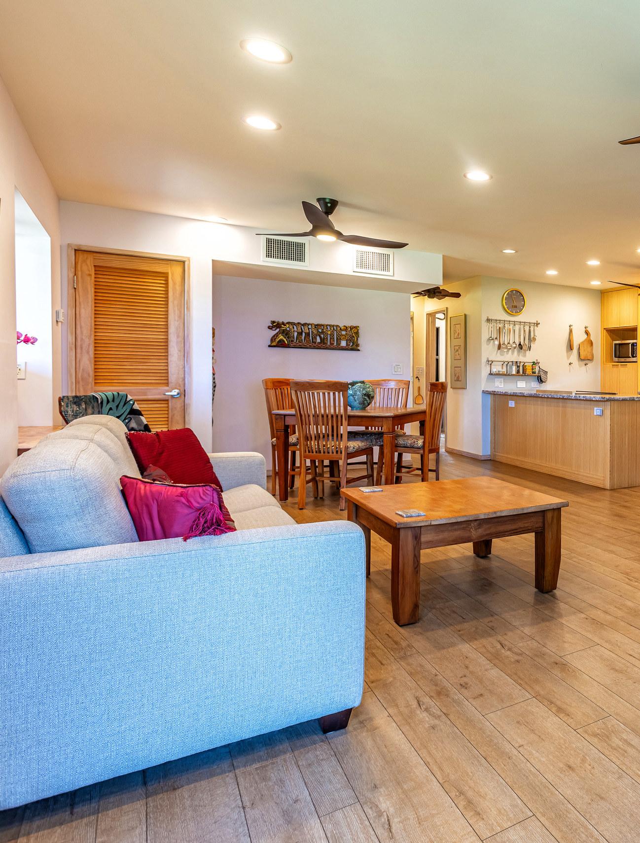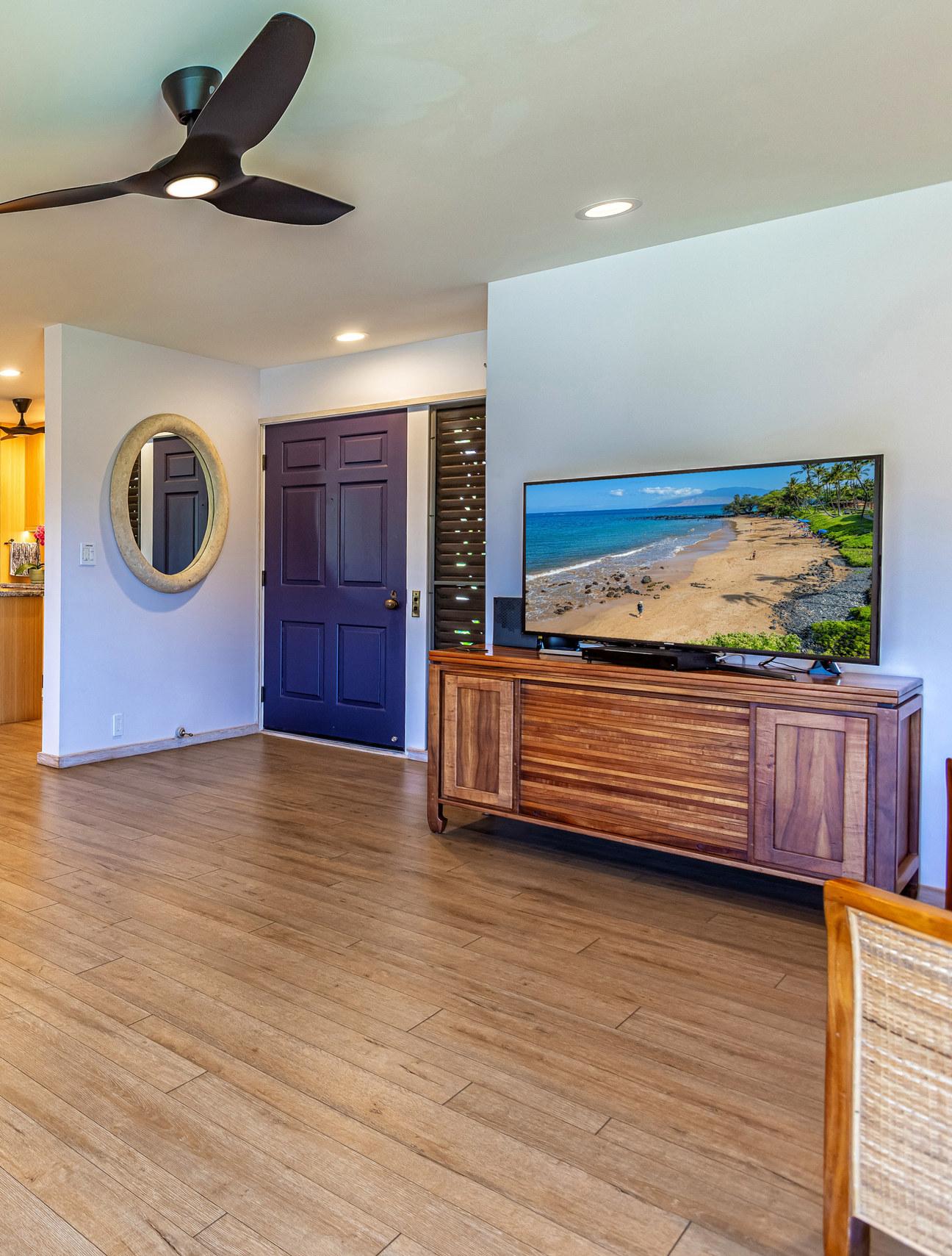 Wailea Elua is a revered, Hotel Resort Zoned, 24-acre Oceanfront veritable Garden of Eden! This World-Class low-density property enjoys an unparalleled amount of direct ocean/beach & ‘Wailea Walkway’ frontage! It is 1 of 2 esteemed guard-gated Wailea condominiums & its owners value a loyal historic following of returning vacationers. Elua 1101 was lovingly & comprehensively renovated in 2018. Throughout the open & spacious floor plan, there is luxury vinyl wood-like flooring & ceiling sound insulation. The light-filled interior is enhanced with recessed LED gallery-quality lighting. Fine quality ‘Western Windows’ & Sliding Doors replaced all the original infrastructure. A lovely juxtaposition of clean, contemporary, & eco-friendly natural organic elements are featured. Stunning natural grain Douglas Fir wood doors & vertical, book-matched, blond bamboo cabinetry are contrasted with Hans-Grohe brushed stainless steel fixtures, & the fabulous patterns & textures of the specimen silver-grey-white granite counters & full-height backsplashes. Noticeable are the extended vertical granite counter-fronts in the kitchen & bath. Bosch stainless steel appliances include an induction cooktop & an under-mount Vigo sink that fit seamlessly into this chef’s kitchen. The scale of the book-matched specimen granite shower surround, the whirlpool tub, the handblown glass door pulls, the spun-stainless steel under-mount sinks, & even the choice of the brushed stainless steel shower head filter, allude to an intentional designer’s touch! Within sight of all this, the glistening LG-Eco washer/dryer speaks of another intentional design element. There is on-demand filtered hot water! The numerous ‘Haiku Fans’ are the finest in the industry & assist the central AC system with climate control! Lying in the king-size bed, enjoy the 2 adjoining corner windows that afford a lovely ocean view through the lushly landscaped green-belt & the oversized covered lanai, which is perfect for lounging or alfresco dining! There is also an abundance of closet & storage space in Wailea Elua 1101. The world-class Shops at Wailea, 3 magnificent golf courses, a tennis/pickleball center, Michelin-starred gourmet restaurants, & Maui’s finest beaches are at your fingertips! Sold Turn-Key Furnished! MLS # 402591