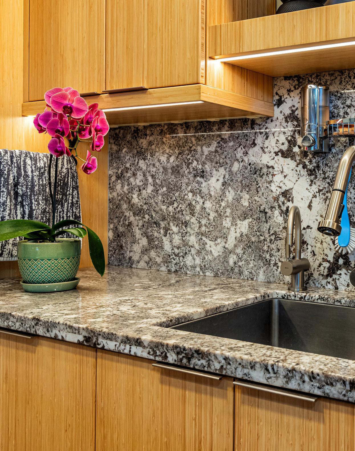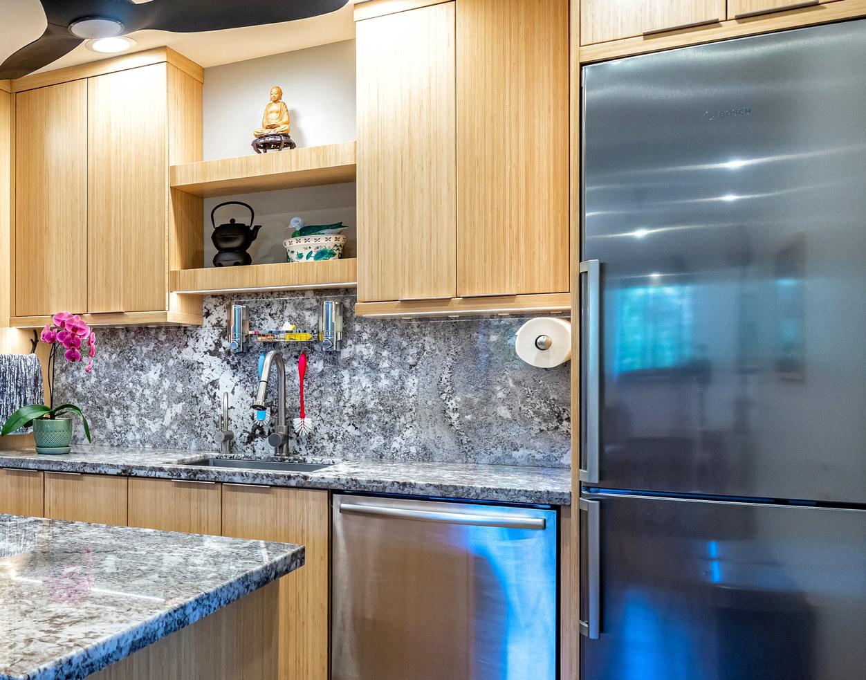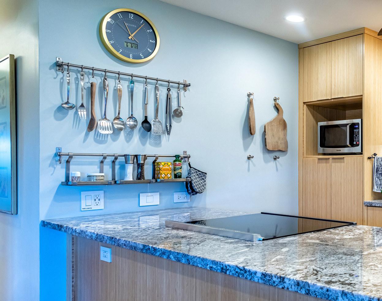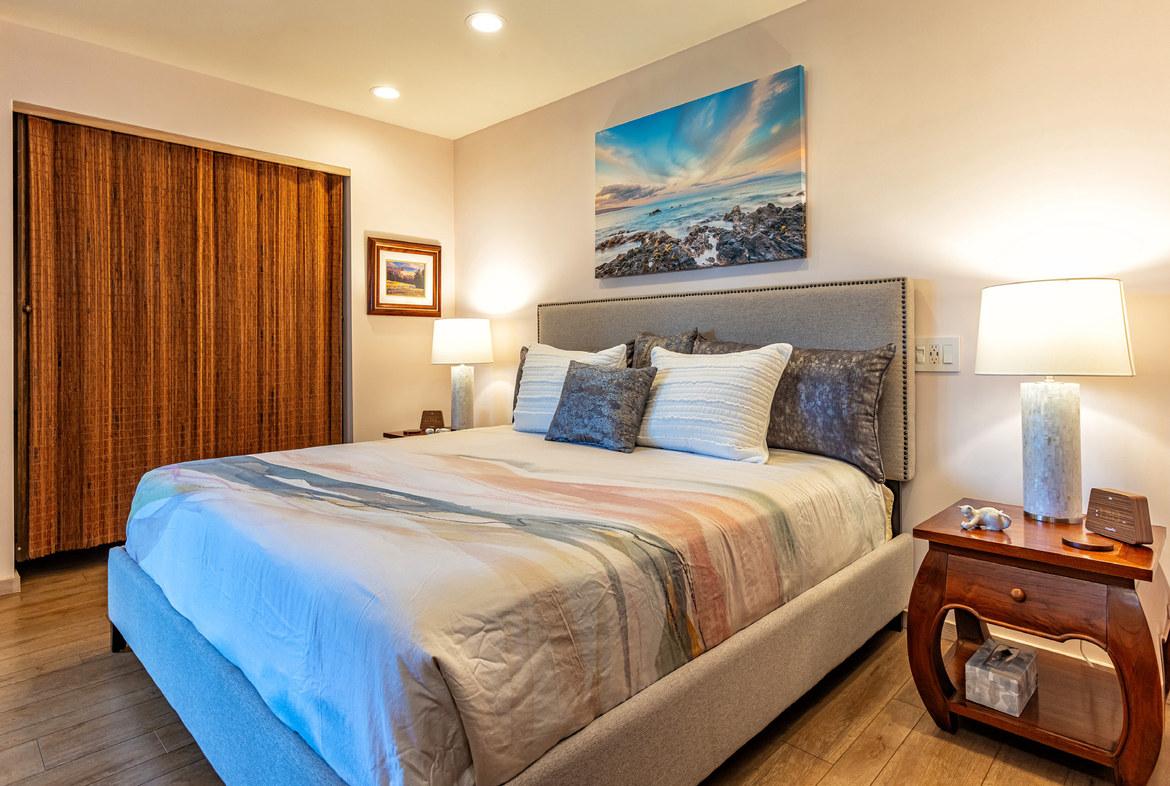 Wailea Elua is a revered, Hotel Resort Zoned, 24-acre Oceanfront veritable Garden of Eden! This World-Class low-density property enjoys an unparalleled amount of direct ocean/beach & ‘Wailea Walkway’ frontage! It is 1 of 2 esteemed guard-gated Wailea condominiums & its owners value a loyal historic following of returning vacationers. Elua 1101 was lovingly & comprehensively renovated in 2018. Throughout the open & spacious floor plan, there is luxury vinyl wood-like flooring & ceiling sound insulation. The light-filled interior is enhanced with recessed LED gallery-quality lighting. Fine quality ‘Western Windows’ & Sliding Doors replaced all the original infrastructure. A lovely juxtaposition of clean, contemporary, & eco-friendly natural organic elements are featured. Stunning natural grain Douglas Fir wood doors & vertical, book-matched, blond bamboo cabinetry are contrasted with Hans-Grohe brushed stainless steel fixtures, & the fabulous patterns & textures of the specimen silver-grey-white granite counters & full-height backsplashes. Noticeable are the extended vertical granite counter-fronts in the kitchen & bath. Bosch stainless steel appliances include an induction cooktop & an under-mount Vigo sink that fit seamlessly into this chef’s kitchen. The scale of the book-matched specimen granite shower surround, the whirlpool tub, the handblown glass door pulls, the spun-stainless steel under-mount sinks, & even the choice of the brushed stainless steel shower head filter, allude to an intentional designer’s touch! Within sight of all this, the glistening LG-Eco washer/dryer speaks of another intentional design element. There is on-demand filtered hot water! The numerous ‘Haiku Fans’ are the finest in the industry & assist the central AC system with climate control! Lying in the king-size bed, enjoy the 2 adjoining corner windows that afford a lovely ocean view through the lushly landscaped green-belt & the oversized covered lanai, which is perfect for lounging or alfresco dining! There is also an abundance of closet & storage space in Wailea Elua 1101. The world-class Shops at Wailea, 3 magnificent golf courses, a tennis/pickleball center, Michelin-starred gourmet restaurants, & Maui’s finest beaches are at your fingertips! Sold Turn-Key Furnished! MLS # 402591
