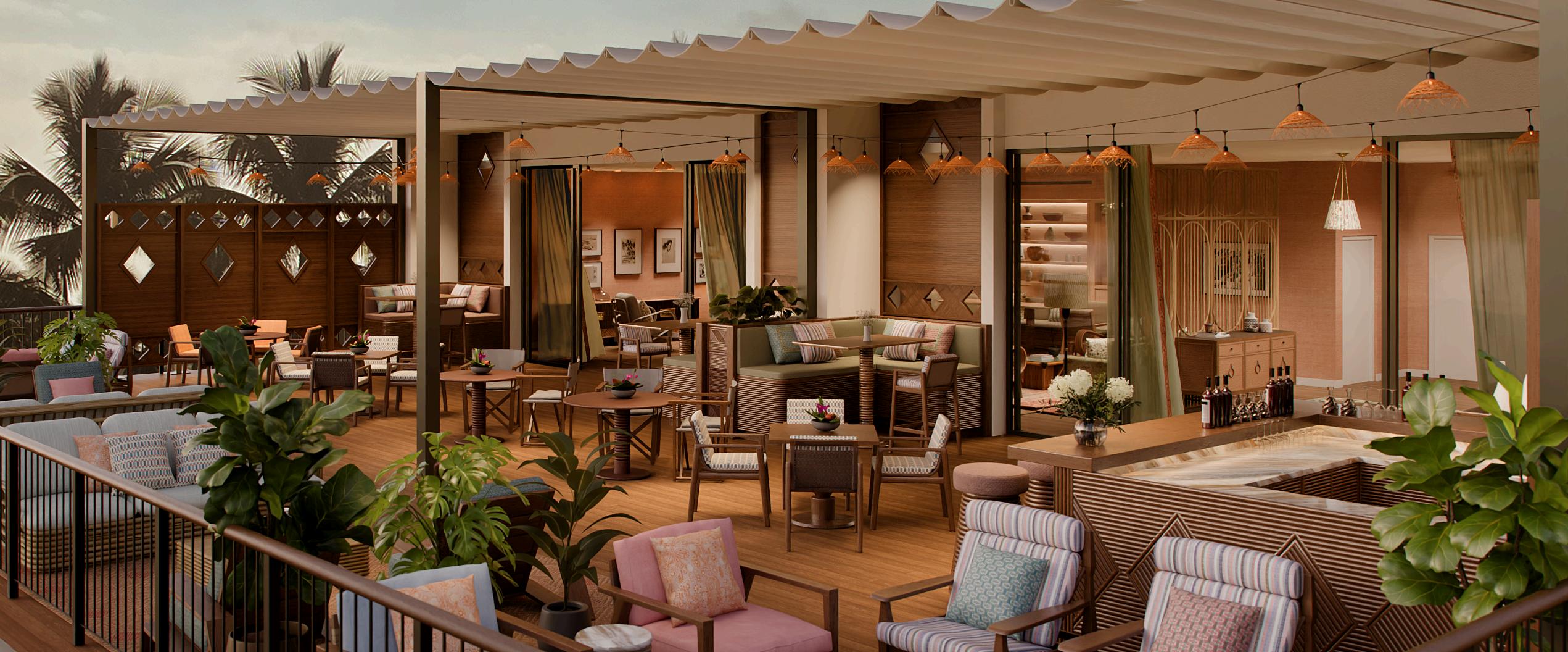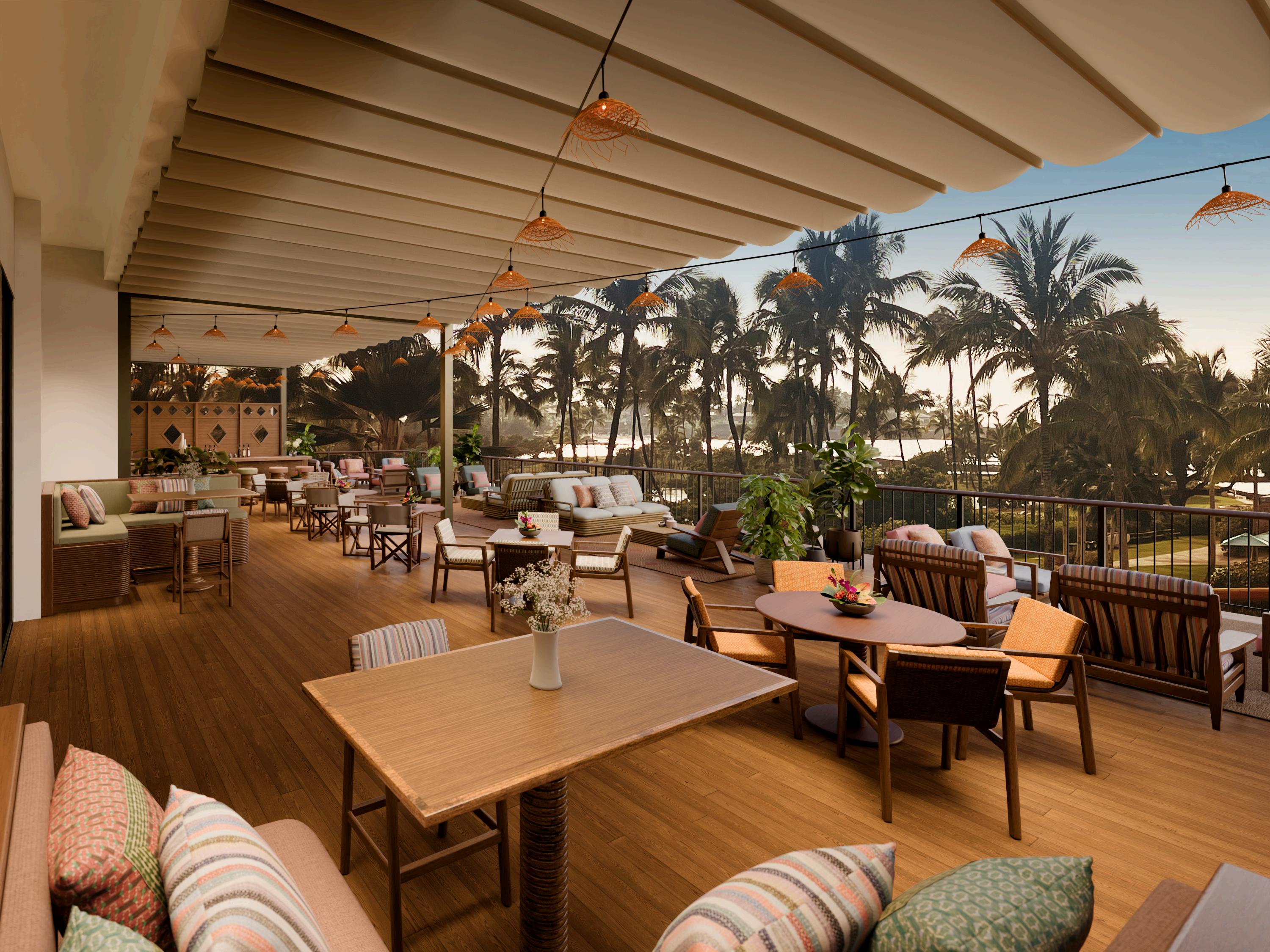 Just beyond, the Lanai offers expansive ocean views and its own bar, overlooking the pools, beach, and sunset as the experience extends effortlessly outdoors.