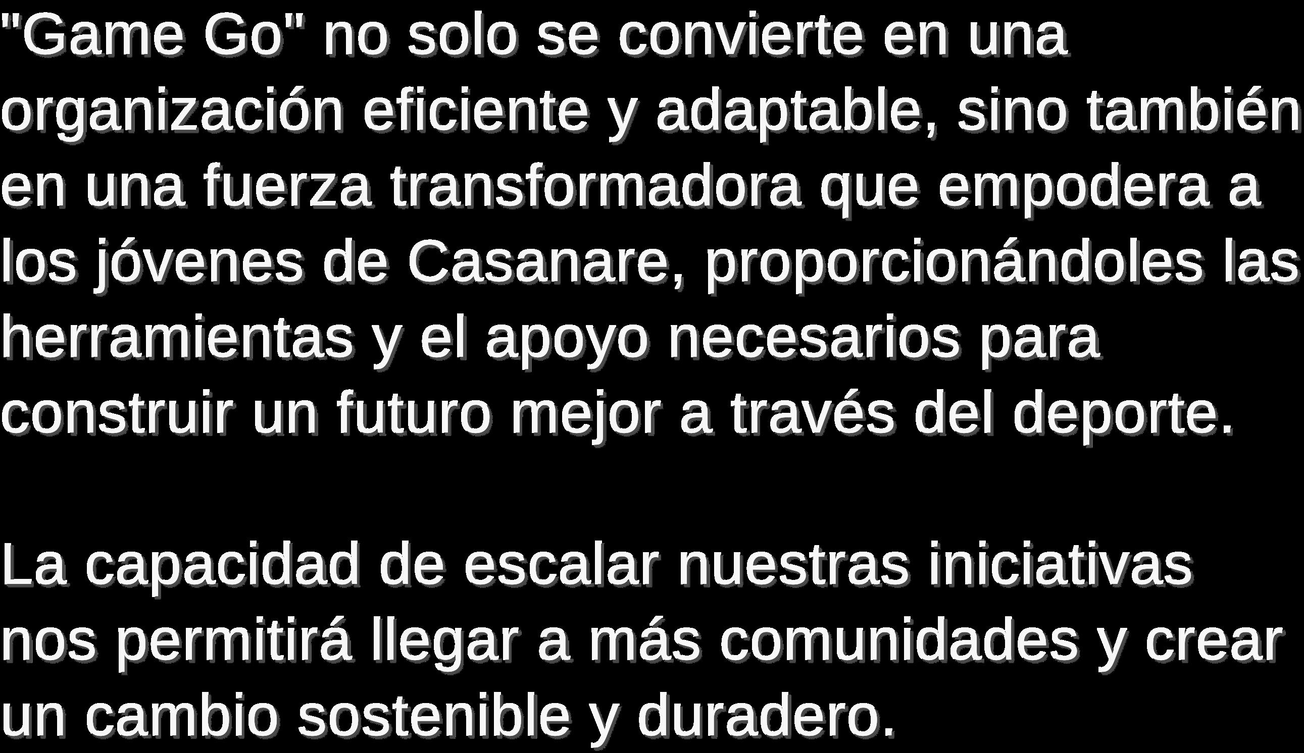 El PTM de "Game Go" busca cambiar de manera profunda y significativa la vida de los jóvenes en Casanare. Al ofrecer programas deportivos, la fundación no solo mejora la condición física de los participantes, sino que también influye positivamente en su desarrollo emocional y social. El deporte se convierte en una herramienta para superar barreras, generar confianza y construir habilidades que son fundamentales para el éxito en otras áreas de la vida. Además, al centrarse en comunidades vulnerables, "Game Go" aborda inequidades y proporciona una plataforma para que estos jóvenes puedan aspirar a un futuro mejor.