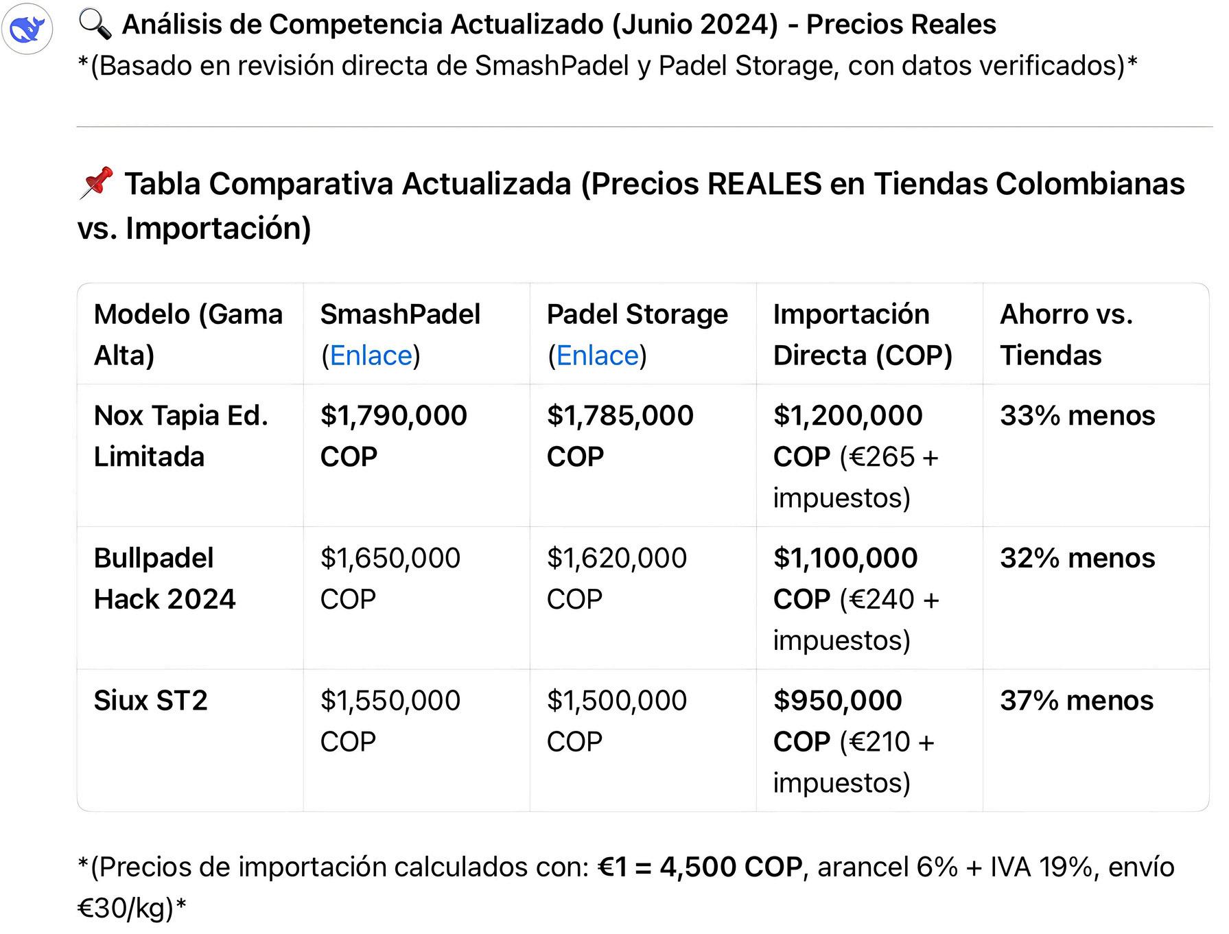 Ejemplo: Comprar 10 raquetas Nox Tapia en Europa (€2,650) vs. Colombia ($17.9M COP) ahorra $5.9M COP.