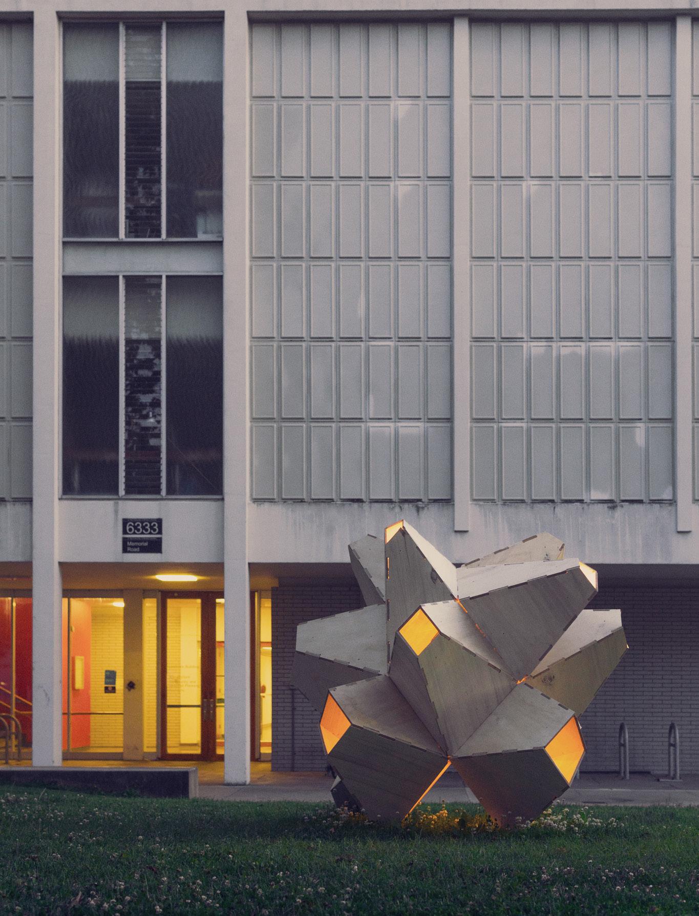 The design began with the intention to create a human-sized lantern articulated with different aperature sizes extruded and skewed in different directions, similar to an amethyst gemstone. The inital massing began with a simple capsule form segmented using a diagrid. Aperatures were extruded using the centerpoints of each diagrid. Its size, extrusion length, and direction were parameterized and varied using a random generator.