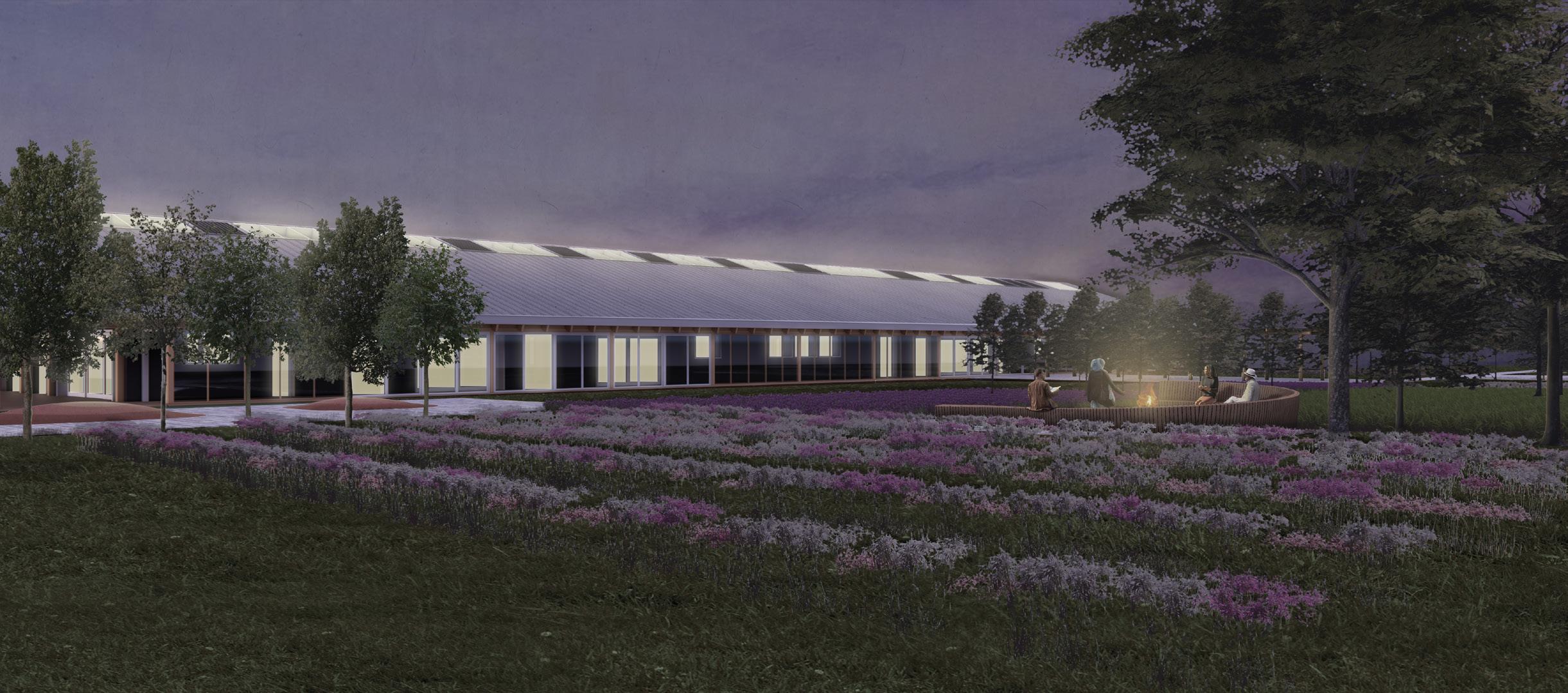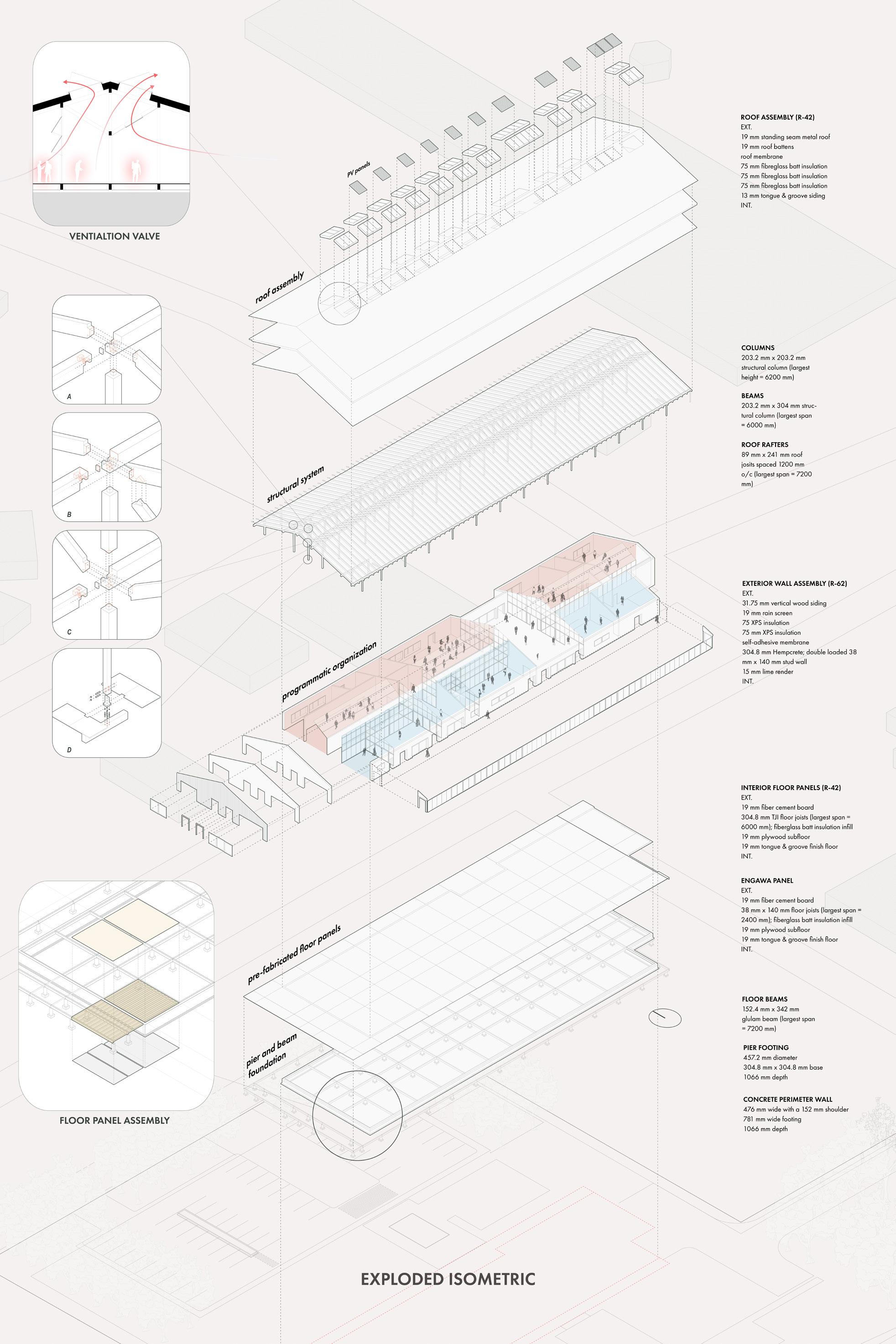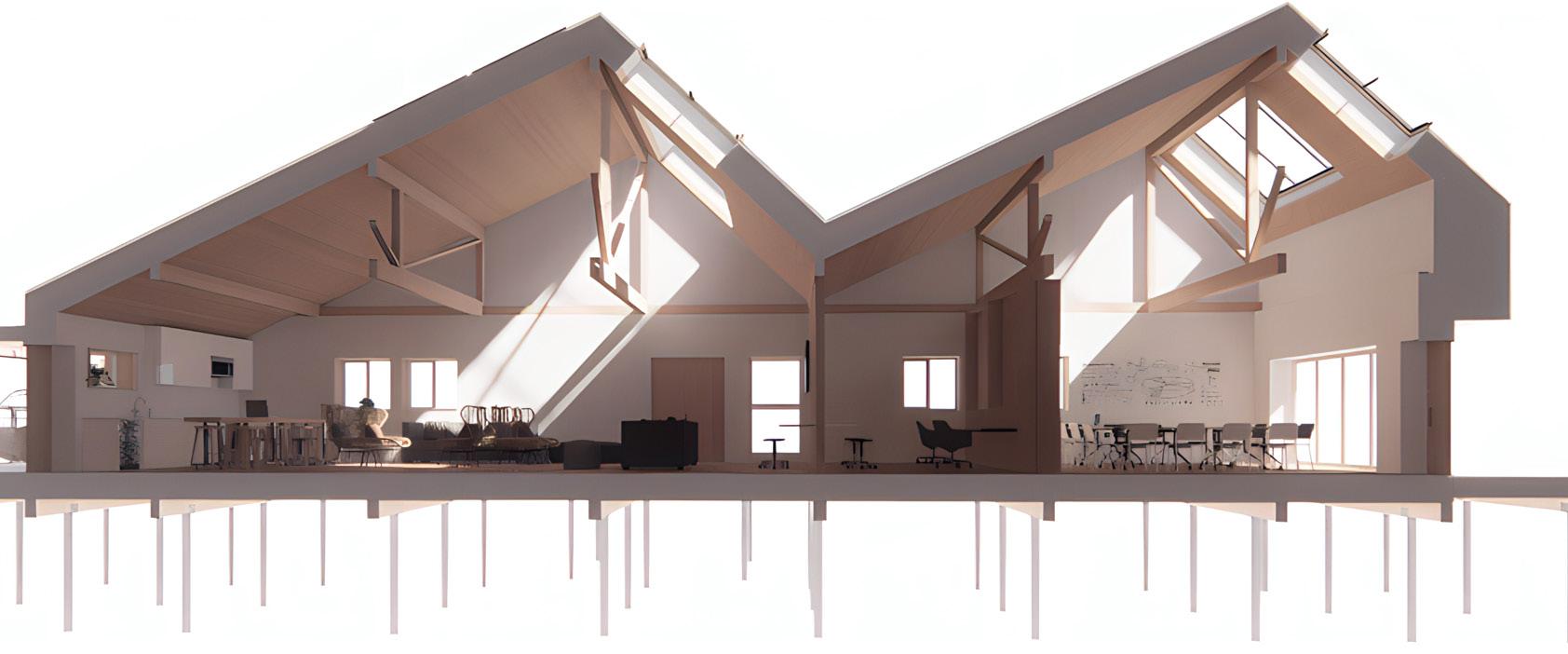 The goal of the proejct is to design and construct one of the first buildings in Canada to be net-zero carbon within its lifetime. In order to achieve this goal, the building drew on principles of passive design. The dual sawtooth roof line optimizes passive daylighting and natural ventiliation, minimizing the operational carbon needed to run mechanical and cooling systems throughout the year. The adaptive re-use of recyceld building materials in the project and the use of carbon negative hempcrete as insulation and thermal mass were primary strategies for minimizing the project’s emobided carbon. All design decisions were tested in energy models, daylight simulation, and life-cycle carbon analyses.