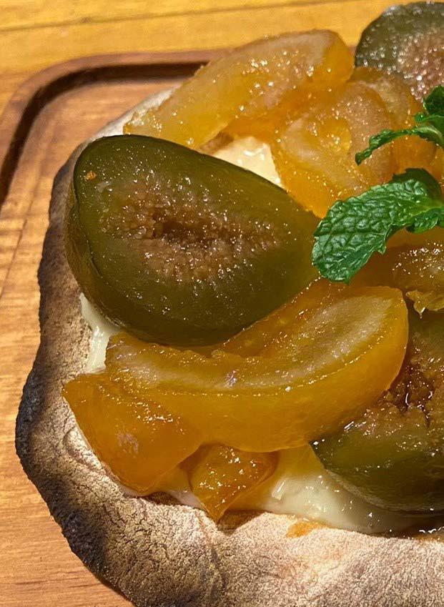 Para preparar sua Pizza Tropical, a chef utilizou o Doce de Nata, os Figos e a Laranja em Calda da Reserva de Minas e deu um toque de frescor com folhinhas de hortelã.