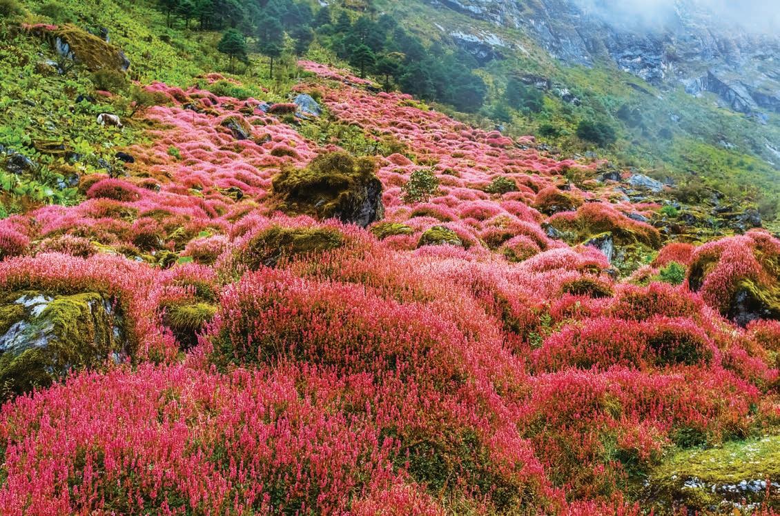 Plants in full bloom along the slopes of the Himalayas in autumn as a mist descends near Tawang, Arunachal Pradesh.