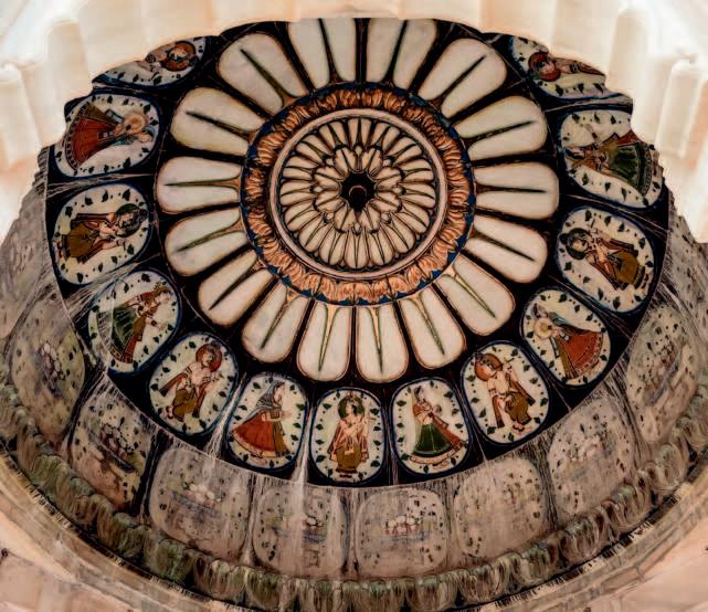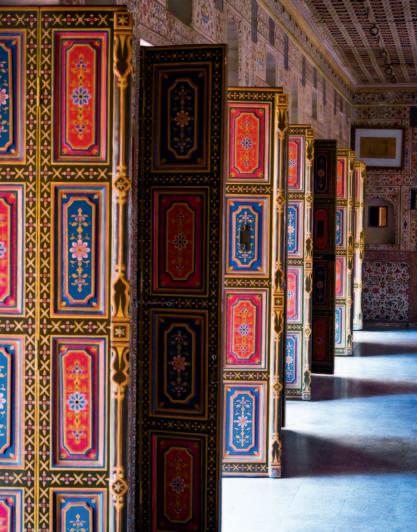 The Lalgarh Palace (above), now a heritage hotel, is another architectural masterpiece, blending Rajputana and European styles. What can further pique your interest in Rajput art is Devi Kund (left) — located on the city outskirts — with beautiful cenotaphs (chhatri) including that of Maharaja Surat Singh. One of the most well-known attractions, however, is the Junagarh Fort (facing page, bottom). Featuring intricate embellishments in sandstone and marble (facing page, top left), the magnificent 16th century fort is one of the grandest and most well-maintained forts in Rajasthan. It is home to a preserved World War I bomber plane (facing page, top right)! Also, catch glimpses of the erstwhile royal family's life and the region's traditional art at the fort's Prachina Museum.